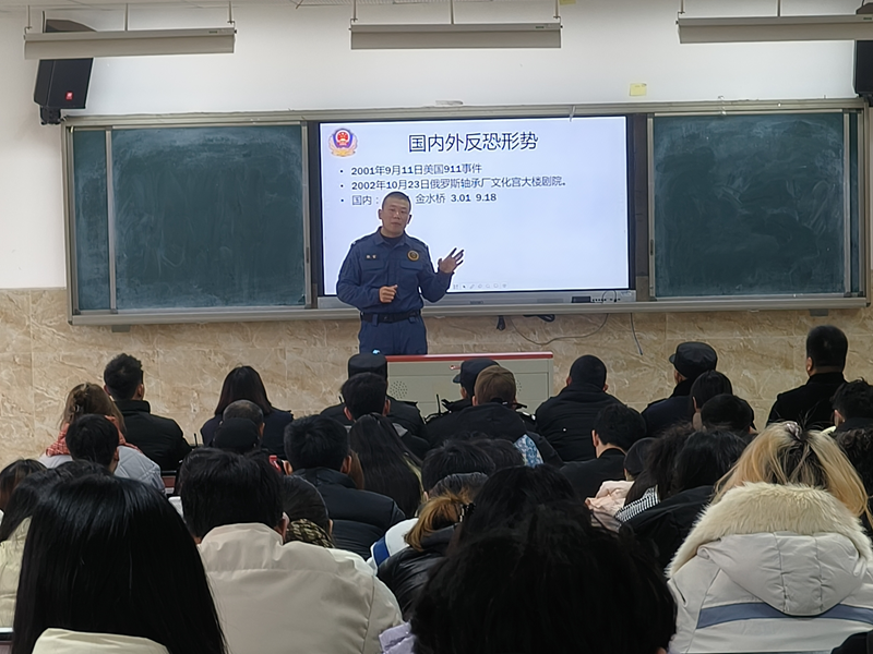 讲座中,潘警官分别从什么是恐怖主义、恐怖主义离我们有多远、遇到恐怖袭击怎么办这几个方面进行讲解,通过播放反恐视频,讲解案例,用一组组震惊的数字、一个个鲜活的事例,向大家灌输反恐相关知识,教导大家要学会如何正确应对。潘警官强调,反恐工作离不开全校师生员工的支持,希望同学们可以进一步提高思想认识,增强风险意识,居安思危,主动了解和掌握反恐、防恐基本知识和技能,警惕身边潜在的恐怖活动威胁,主动做好自身的安全防范工作,同时也希望广大师生积极踊跃举报涉恐涉暴犯罪线索,切实履行好法律赋予公民的权利和义务,共同营造出“全民反恐、共筑平安”的校园安全稳定的浓厚氛围。