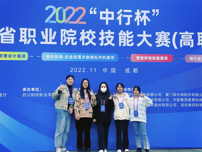 2022年11月11日-12日,四川省职业院校技能大赛高职组“银行业务综合技能”赛项在四川财经职业学院成功举办,来自全省的20支代表队80名选手同台竞技。beat365英国官方网站财经管理系指导教师高锐带队,普专会计21-2班学生钟玉兰、韦蔼玲、普专会计21-3班学生李雯、张玮玲组队参加。经过两天的激烈角逐,在比赛中团结协作、沉着应战,荣获团体三等奖。