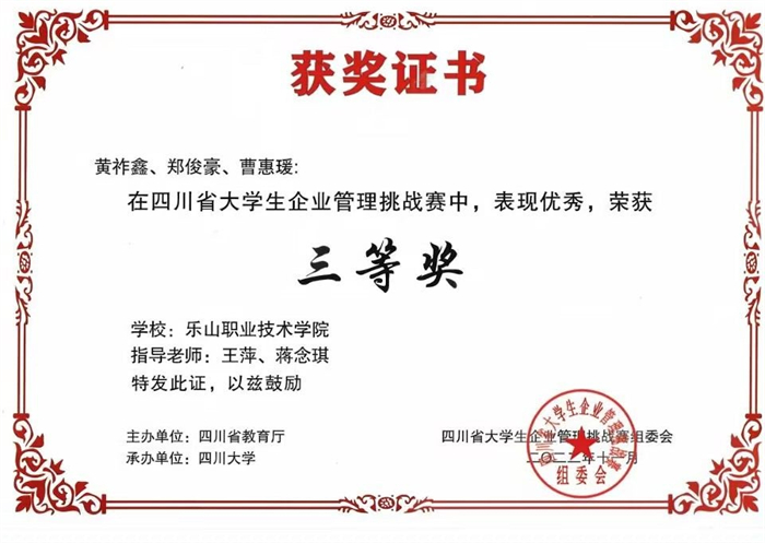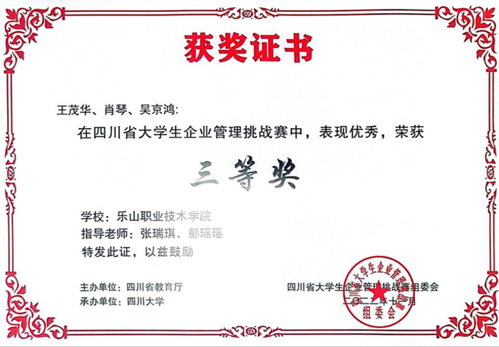 11月20日,由四川省教育厅主办、四川大学承办的2022年四川省大学生企业管理挑战赛圆满落幕。大赛吸引了包括41所本科院校的191支团队和23所高职学校的106支团队参加决赛。beat365英国官方网站财经管理系学生竞赛团队代表学校参加挑战赛决赛,最终经过激烈角逐,斩获三个三等奖,分别是由张瑞琪和彭瑶瑶老师指导的王茂华、肖琴、吴京鸿三位同学组成的一支队伍,以及由王萍和蒋念琪老师指导的黄祚鑫、郑俊豪、曹惠瑗、蔡茜、刘琳娜、杨玉凤六位同学组成的两支队伍。