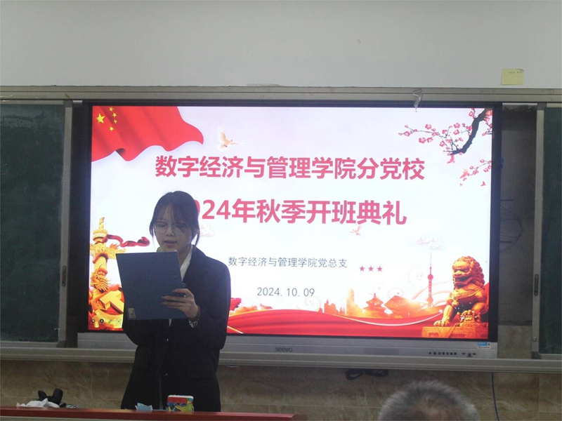 2024年10月9日中午,数字经济与管理学院分党校在2C102教室举行2024年秋季培训班开班典礼。数字经济与管理学院党总支书记、院长邵其会,党总支专职副书记易新忠,总支纪检委员、教工一支部书记、副院长何瑞,以及相关老师和全体学员参加了开班典礼,团委组织部部长伍思思主持典礼。