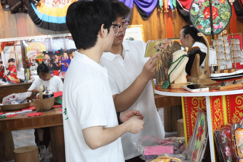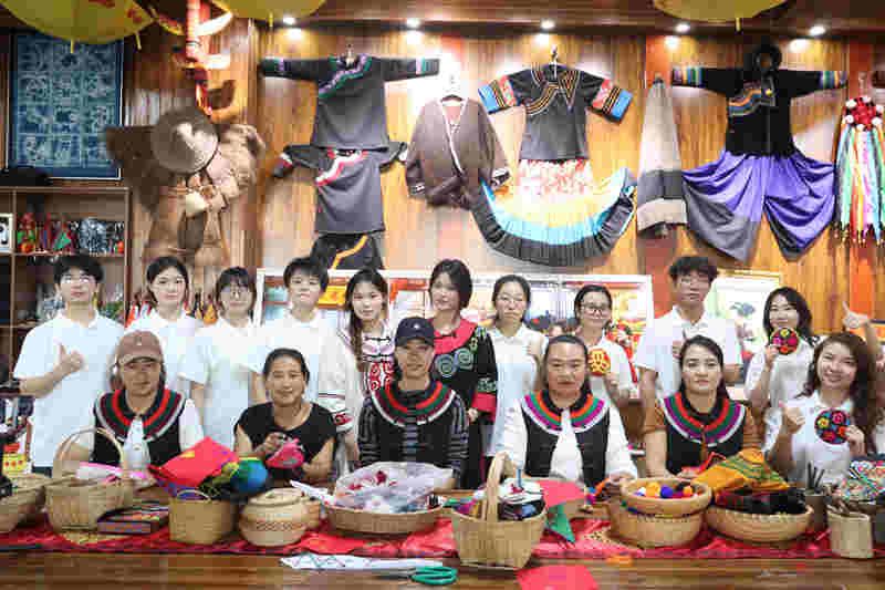 团队在前期调研的基础上,积极探索“推普+非遗”路径,电子商务专业的同学在工坊直播间进行现场直播,介绍推广彝绣产品,讲解纹样寓意、展示成品细节,一件件精美的彝绣手包、团扇、布鞋、挂饰……展示出独特的非遗技艺与民族文化。团队通过“普通话培训+电商直播”等形式,帮助非遗传承人突破语言壁垒,从指尖技艺到指尖经济,实现传统文化与现代经济的融合发展。