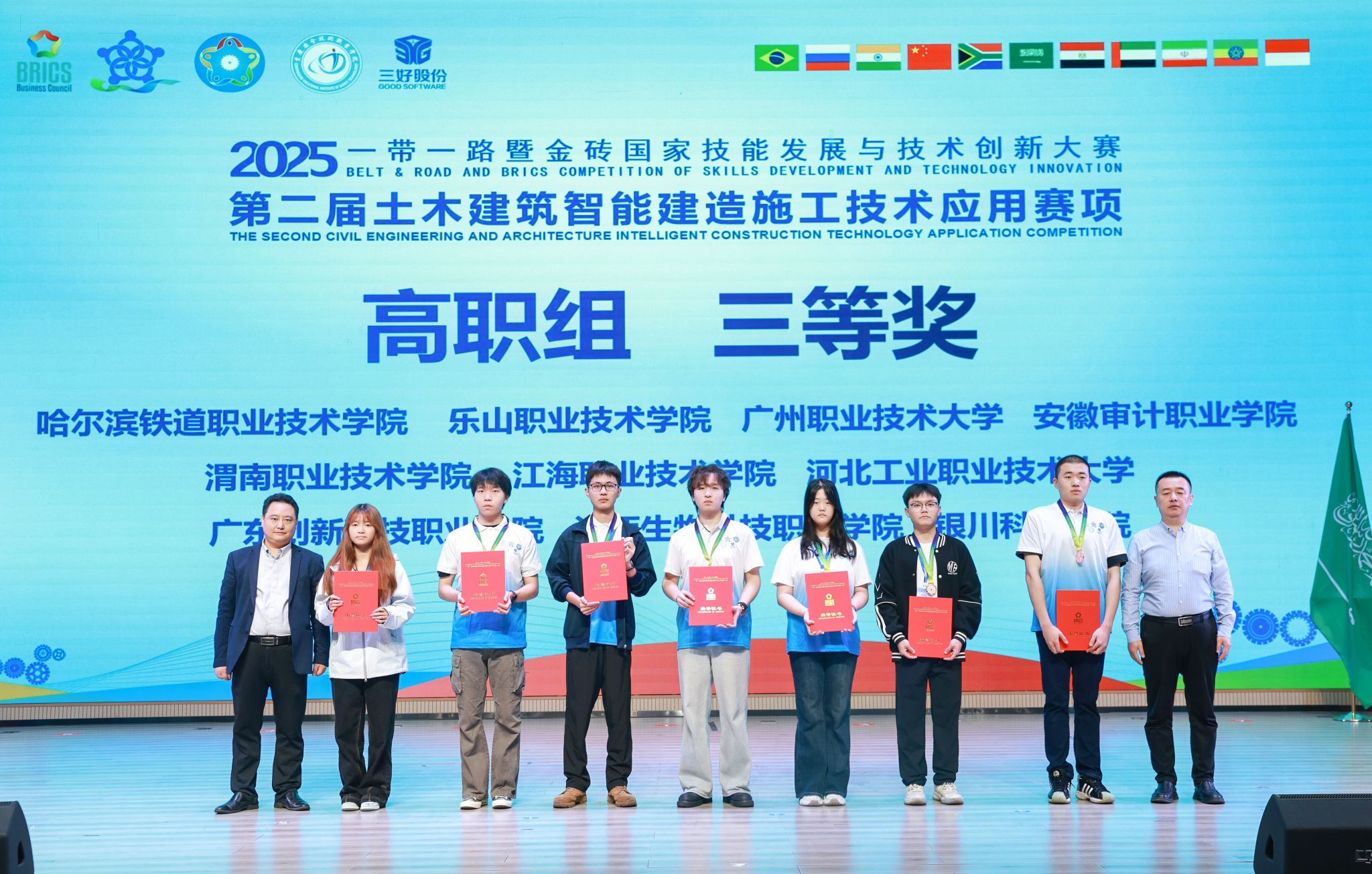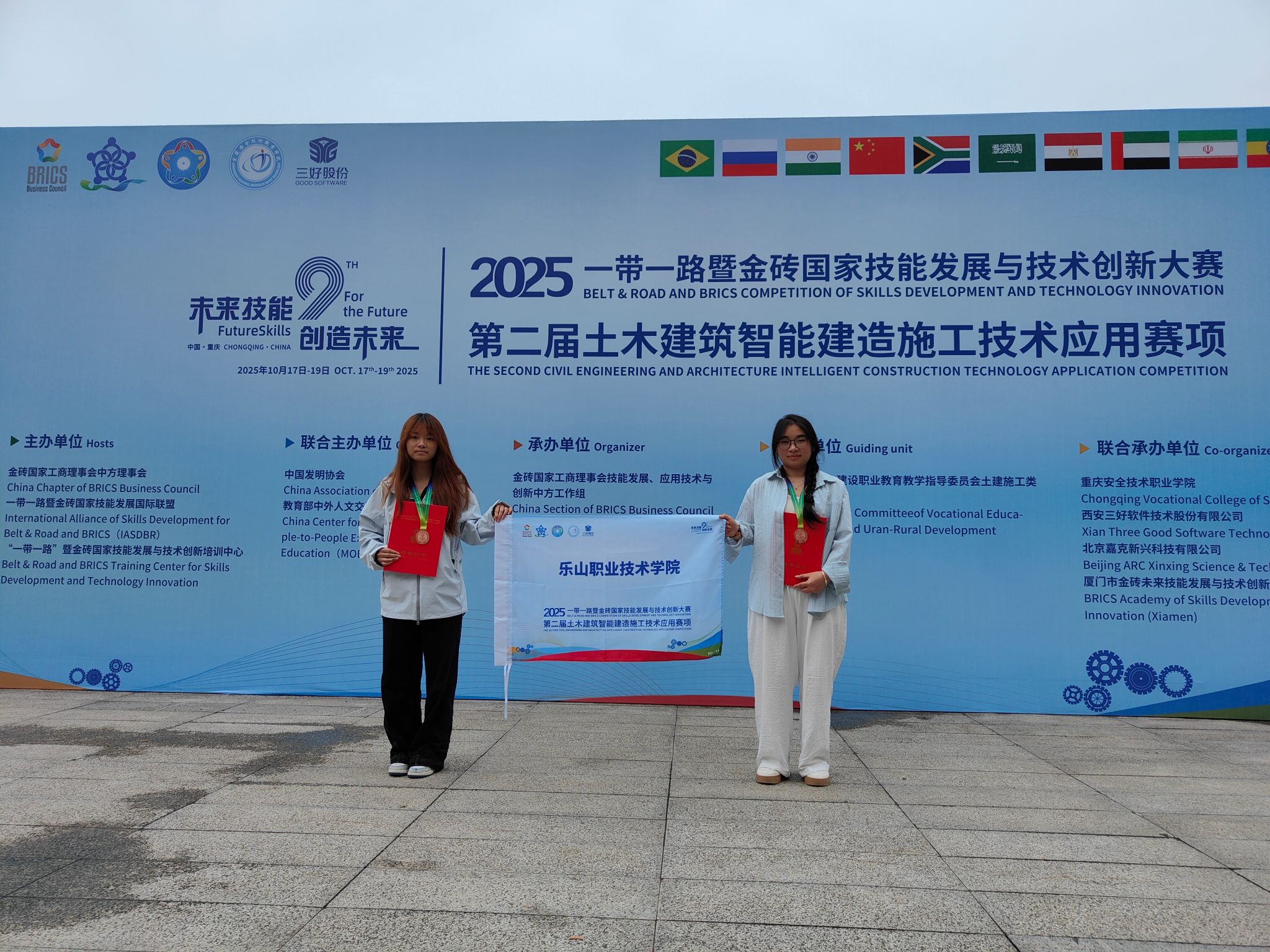 2025年10月17日—19日,2025“一带一路暨金砖国家技能发展与技术创新大赛”第二届土木建筑智能建造施工技术应用赛项高职组决赛在重庆万州落幕。beat365英国官方网站工程造价专业学生唐亚周、苏萍萍组成的学校代表队在区域选拔赛中突出重围,与进入决赛的全国289队选手同台竞技,最终斩获全国三等奖,实现专业在该项赛事上奖牌“零的突破”。