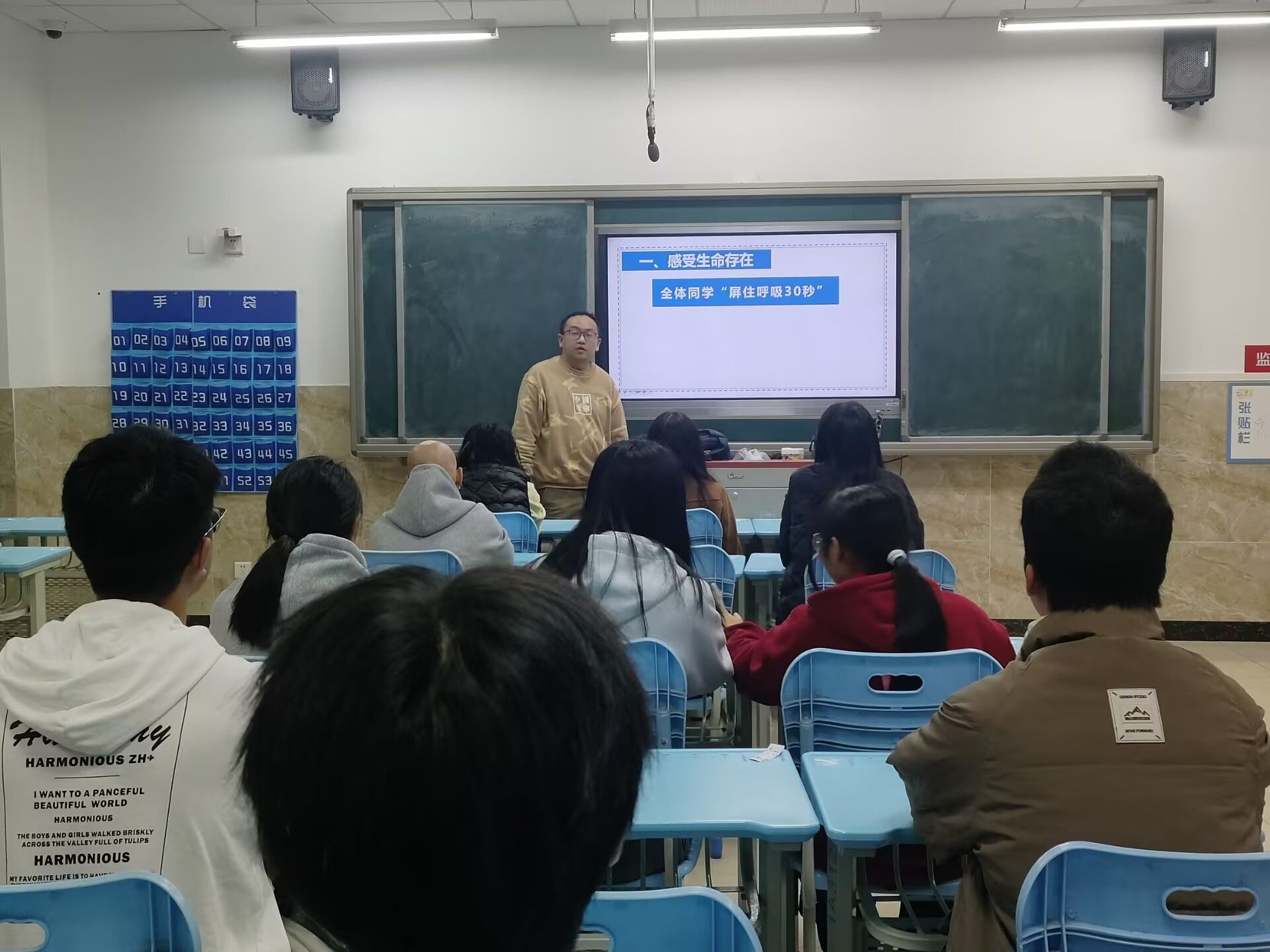 辅导员让全体同学“屏住呼吸30秒”,感受生命存在,生命的可贵;讲述一个人的出生、成长历程,让同学们体验生命的由来与不易;分享乐山女孩雷庆瑶的故事,鼓励同学们始终积极面对人生,理解生命的维度,让自己的生命丰富且有价值。