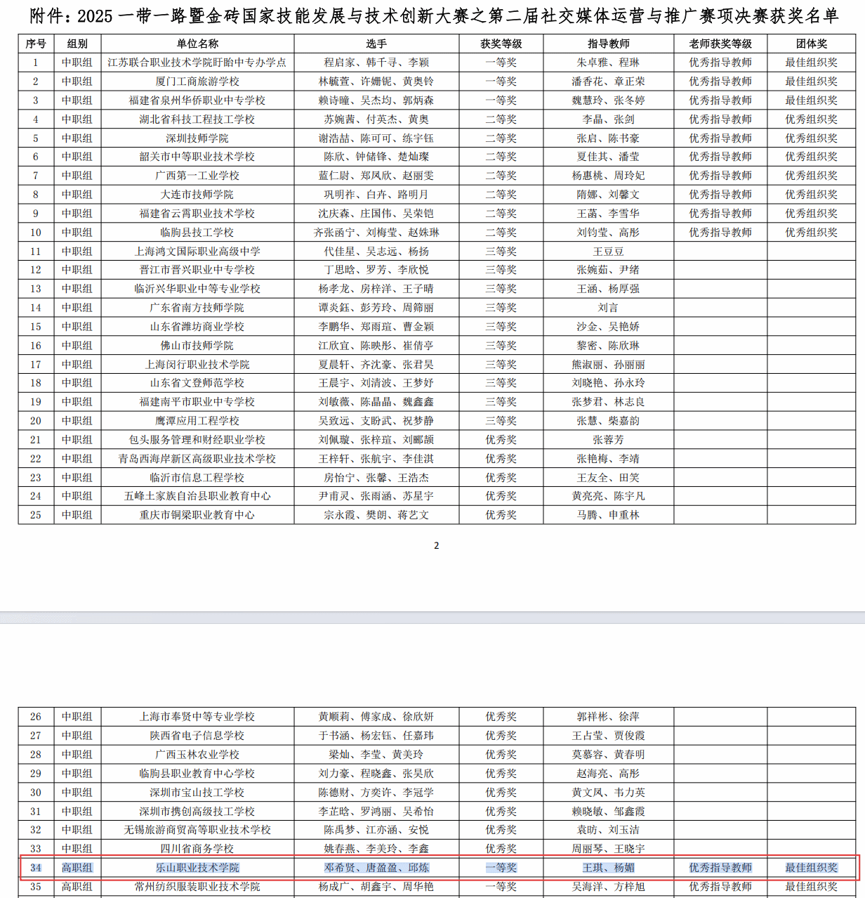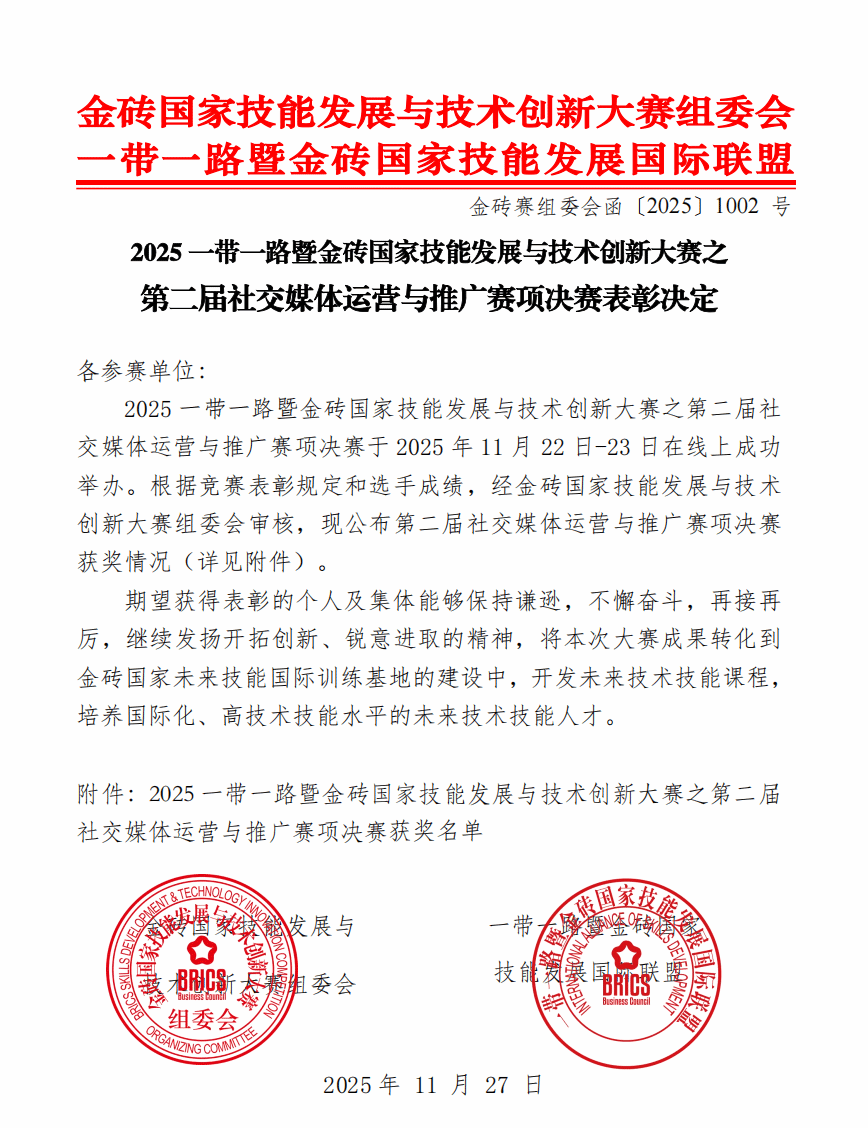 11月26日,2025一带一路暨金砖国家技能发展与技术创新大赛第二届社交媒体运营与推广赛项全国总决赛(高职组)圆满落幕。beat365数字经济与管理学院邓希贤、唐盈盈、邱炼组成的参赛团队一路披荆斩棘,以全国第一名的优异成绩斩获一等奖(金牌),指导教师王琪、杨媚荣获“优秀指导教师”荣誉称号。