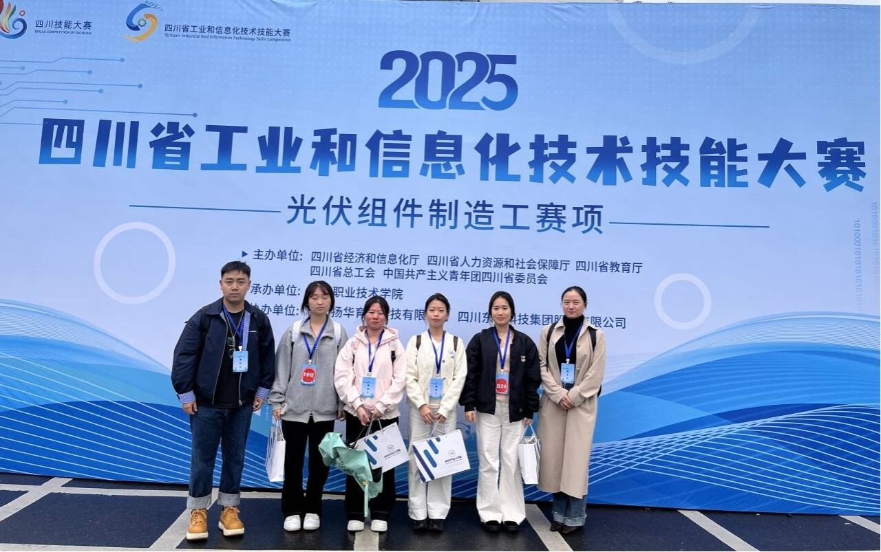 为弘扬劳模精神、劳动精神、工匠精神,加快培养工业和信息化领域高素质技术技能人才,助推我省优势产业提质倍增和重点产业建圈强链,经济和信息化厅、人力资源社会保障厅、教育厅、省总工会、团省委决定联合举办四川技能大赛—2025年四川省工业和信息化技术技能大赛光伏组件制造工 L 赛项。经学院学生报名并选拔,由陈荟、田小彤、张莉、王萌四名同学代表学院组队参赛。
