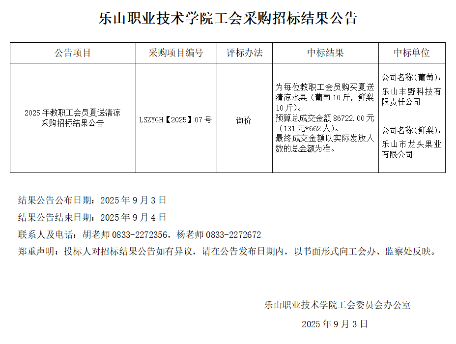 2025年教职工会员夏送清凉采购招标结果公告