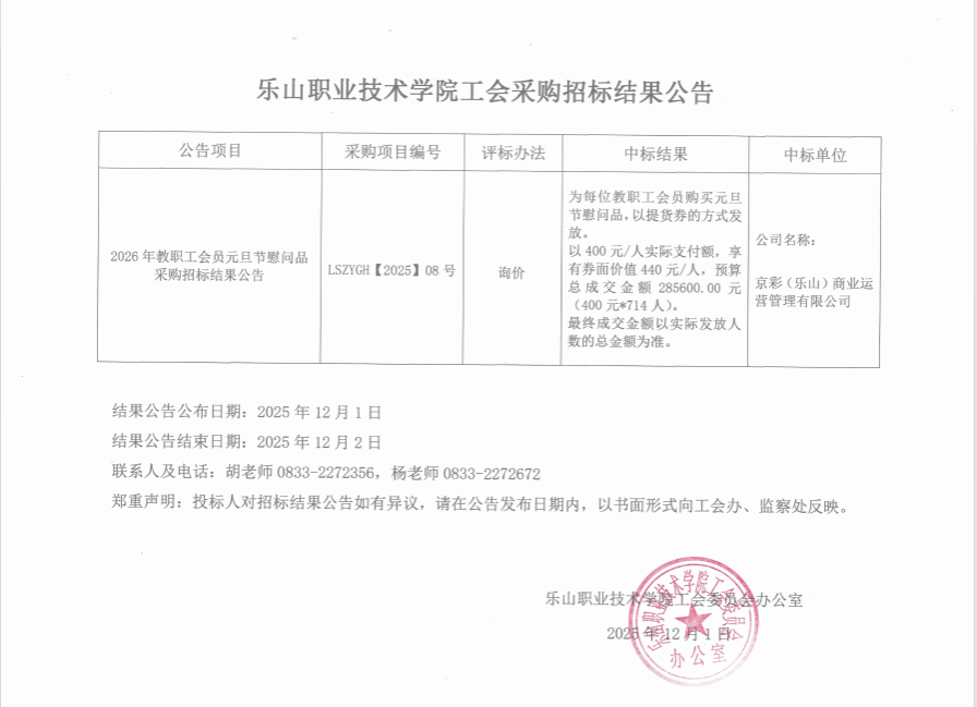 2026年教职工会员元旦节慰问品采购招标结果公告