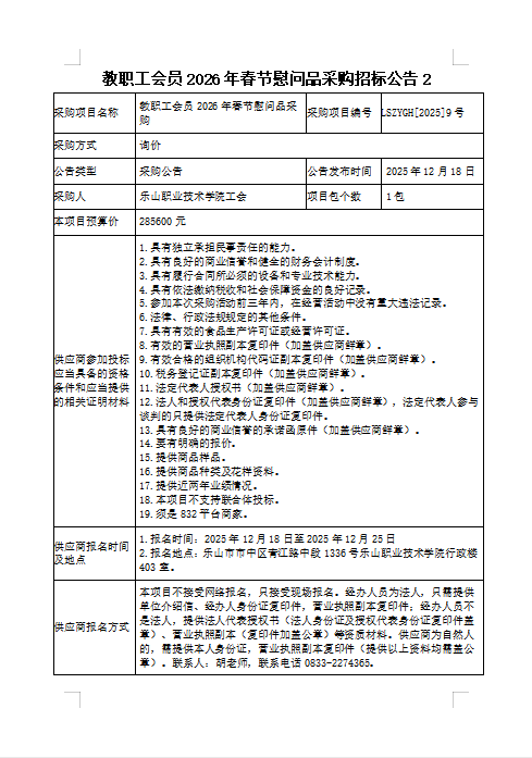 教职工会员2026年春节慰问品采购招标公告2