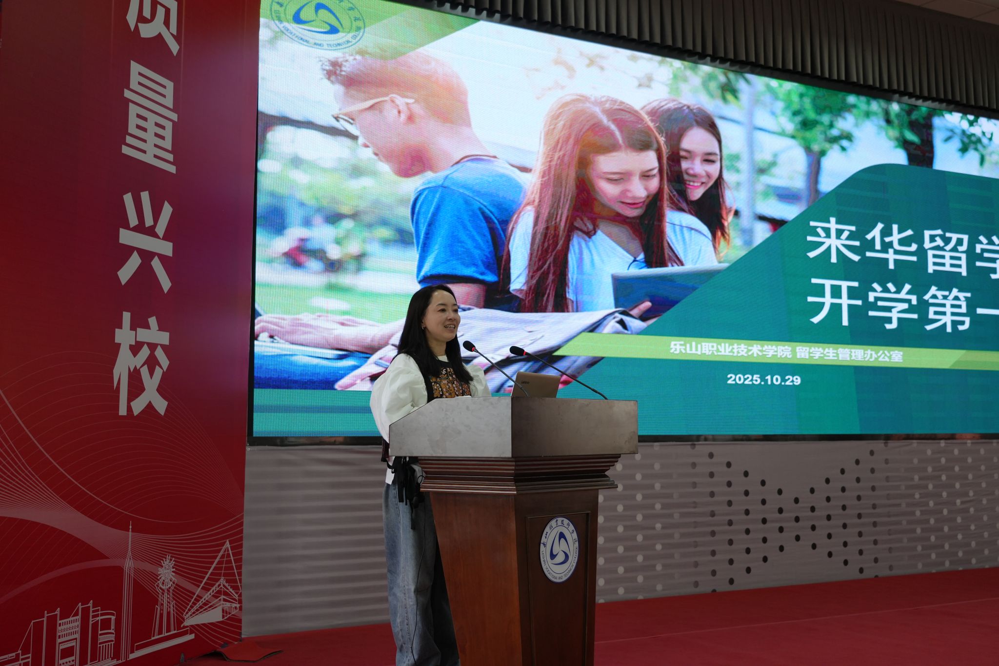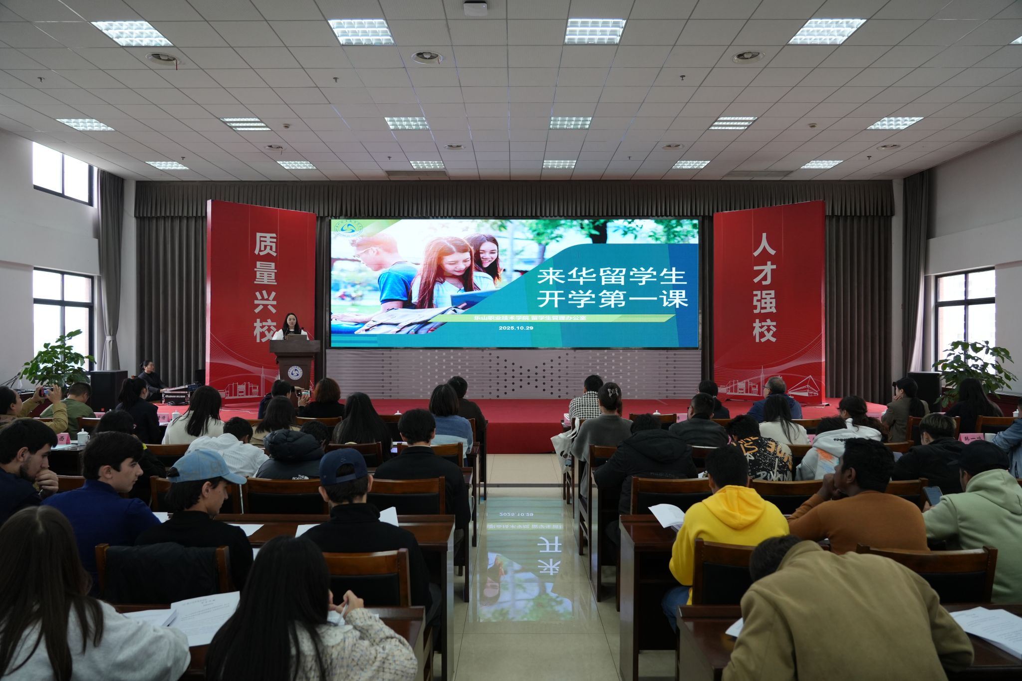 20251029日,beat365英国官方网站在学术交流中心为2025级来华留学生隆重举行开学第一课暨入学教育活动。活动由国际交流合作处副处长张晶晶主持,乐山市中区出入境管理大队、学校各职能部门负责人及全体新生辅导员共同参与,为留学生新生提供了全面系统的入学指导。