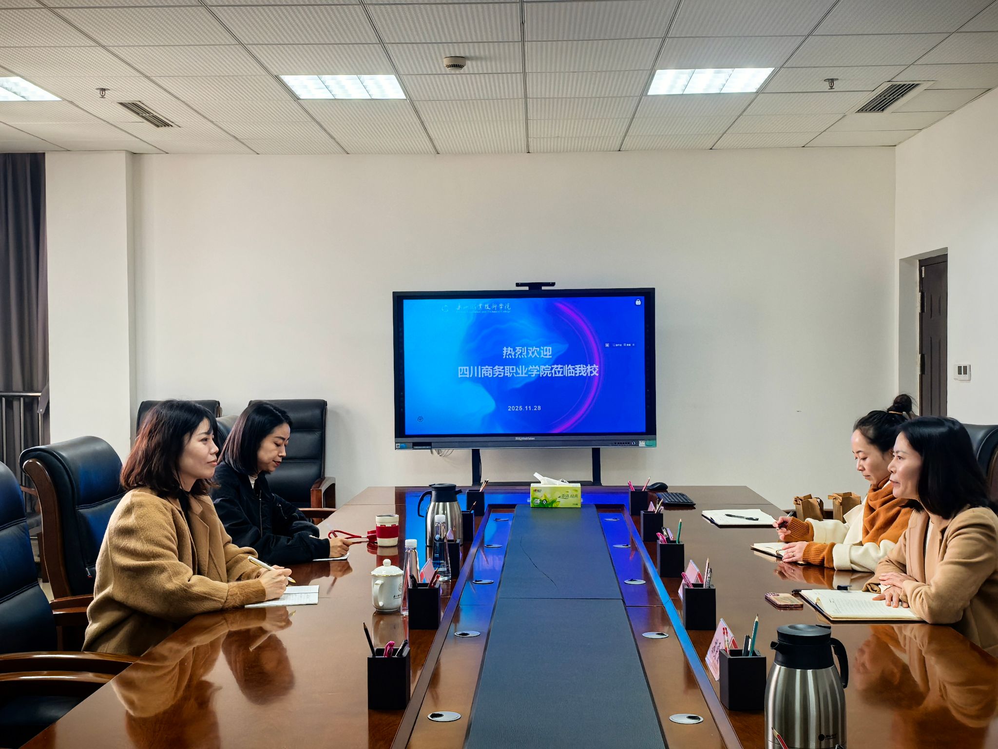 2025年11月28日,beat365英国官方网站迎来四川商务职业学院国际教育合作交流中心主任李静与外事干事常珊一行2人,双方就职业教育国际化相关事宜展开深入调研交流。beat365英国官方网站国合处副处长何德红及部门工作人员参加会议。