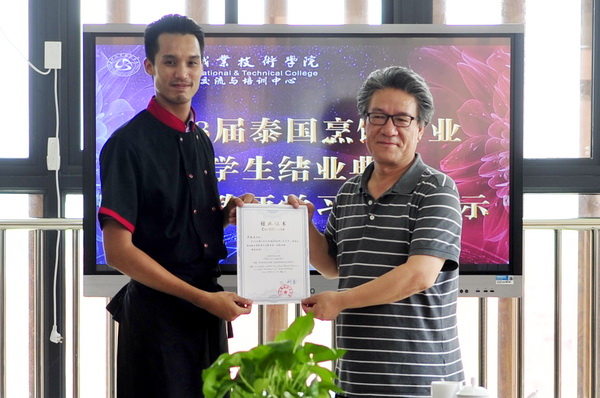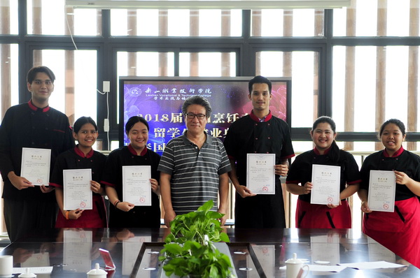 2018年5月18日,2018届泰国烹饪专业留学生结业典礼暨泰国教师进修学习成果展示,在学院学术中心进行。学院党委副书记陈芝海,学院相关部门负责人参加了典礼。结业典礼旅游系副主任何加健主持。 典礼上,陈芝海代表学院为留学生颁发了结业证书并作致辞。他希望即将学成归国的泰国老师罗晓龙及五名泰国留学生,回到自己的祖国后牢记诗灵通公主的殷殷嘱托,继续在学业上不断深造,在专业上更上一层楼,努力将中国的饮食文化发扬光大,让更多的泰国同胞能够感受到川菜的魅力。希望同学们回国以后抽时间回母校看看,继续做好中泰友谊的使者,将这份情谊绵延发展!