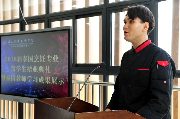 典礼结束后,泰国皇家吉拉达学院的老师罗晓龙及五名泰国留学生进行了现场烹饪操作,学院领导对留学生的学习成果进行了充分的肯定。