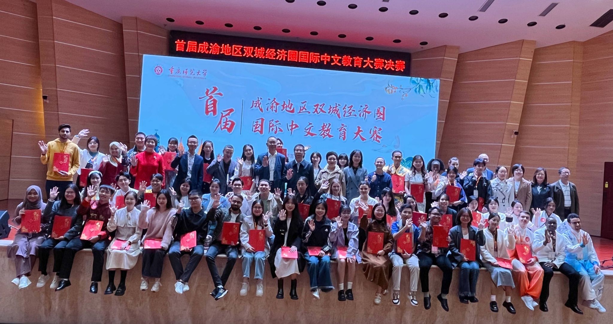 On October 19th, the final of the "First Chengdu-Chongqing Economic Circle International Chinese Education Competition," jointly organized by the Chongqing Municipal Education Commission and the Sichuan Provincial Department of Education, was held at Chongqing Normal University. Thirty Chinese students and 30 international students from universities in Chongqing and Sichuan competed fiercely. Jiang Xingliu and Yang Meilin, international students from our university's class of 2022, won the first and third prizes respectively under the careful guidance of their two instructors, Wu Yuxi and Tang Jing.