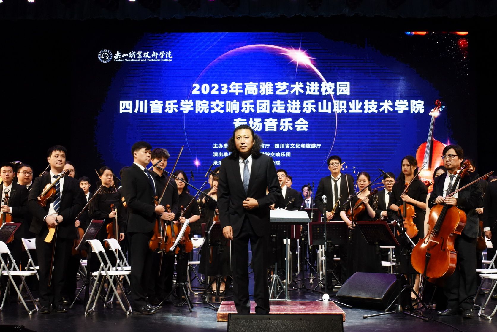 Music conveys the spirit, and art communicates with the world. At 7:00 PM on June 15, 2023, the special concert "Refined Arts on Campus—Sichuan Conservatory of Music Symphony Orchestra at Leshan Vocational and Technical College," co-hosted by the Sichuan Provincial Department of Education and the Sichuan Provincial Department of Culture and Tourism, was successfully held in the college auditorium. Leaders from the Municipal Committee, the Standing Committee of the Municipal People's Congress, the Municipal Government, and the Municipal Political Consultative Conference, as well as leaders from various municipal departments and friendly units, were invited to join over a thousand teachers and students of the college in enjoying this musical feast. Cheng Dingbin, Secretary of the College Party Committee, delivered a welcome speech.