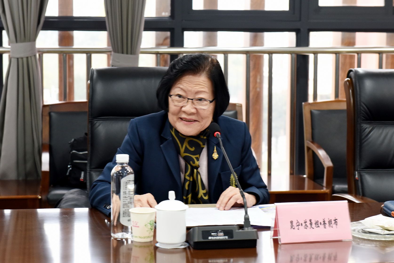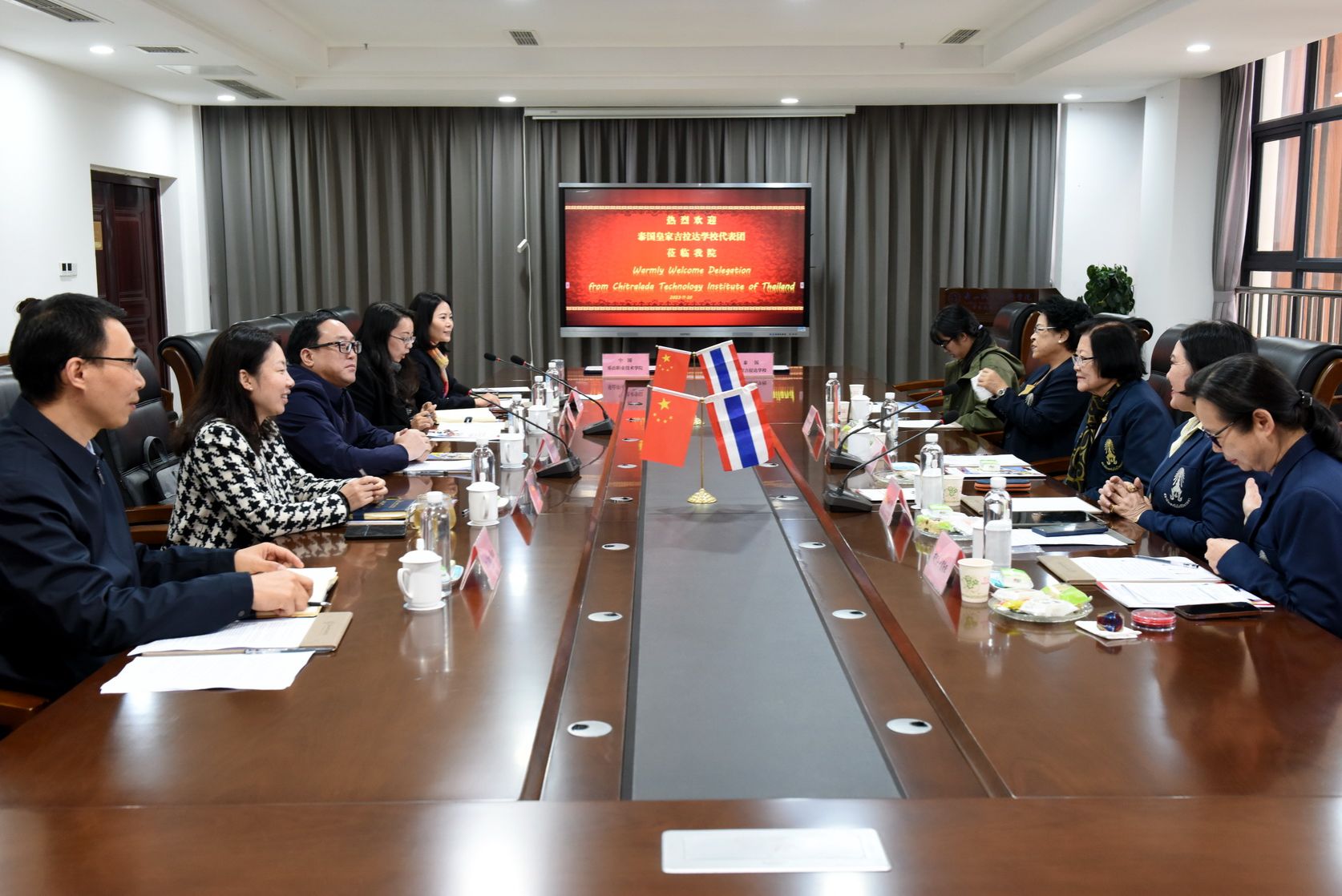 On November 20, 2023, a delegation of four people led by Principal Kunying Sumanat Phrombong of the Royal Girldat Technical College of Thailand visited our school. The exchange symposium was held in the conference room 2001 of the Academic Exchange Center. The Party Committee Secretary of the school, Cheng Dingbin, Vice President Zhou Qin, and the heads of the Academic Affairs Office, the International College, and the Culture and Tourism College attended the symposium, which was presided over by Vice President Zhou Qin.
