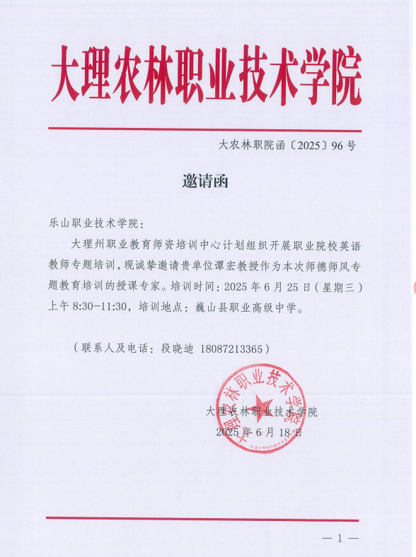 6月25日,受大理农林职业技术学院邀请,赴云南大理州职业教育师资培训中心为近200名基础课教师作《师德师风建设与课程思政设计》专题讲座。结合乐山职院“三全育人”实践经验,提出“师德引领+课程思政”双轮驱动模式,引导教师将思政元素融入专业教学,为提升职教师资素养提供了新范式。