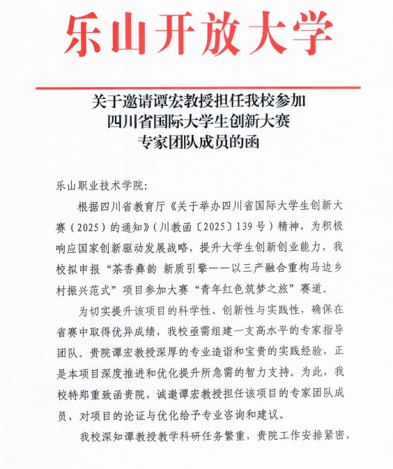 作为乐山开放大学专家团队成员,参与指导“茶香彝韵新质引擎——以三产融合重构马边乡村振兴范式”项目,助力其斩获四川省国际大学生创新大赛“青年红色筑梦之旅”赛道省级金奖,晋级全国排位赛。