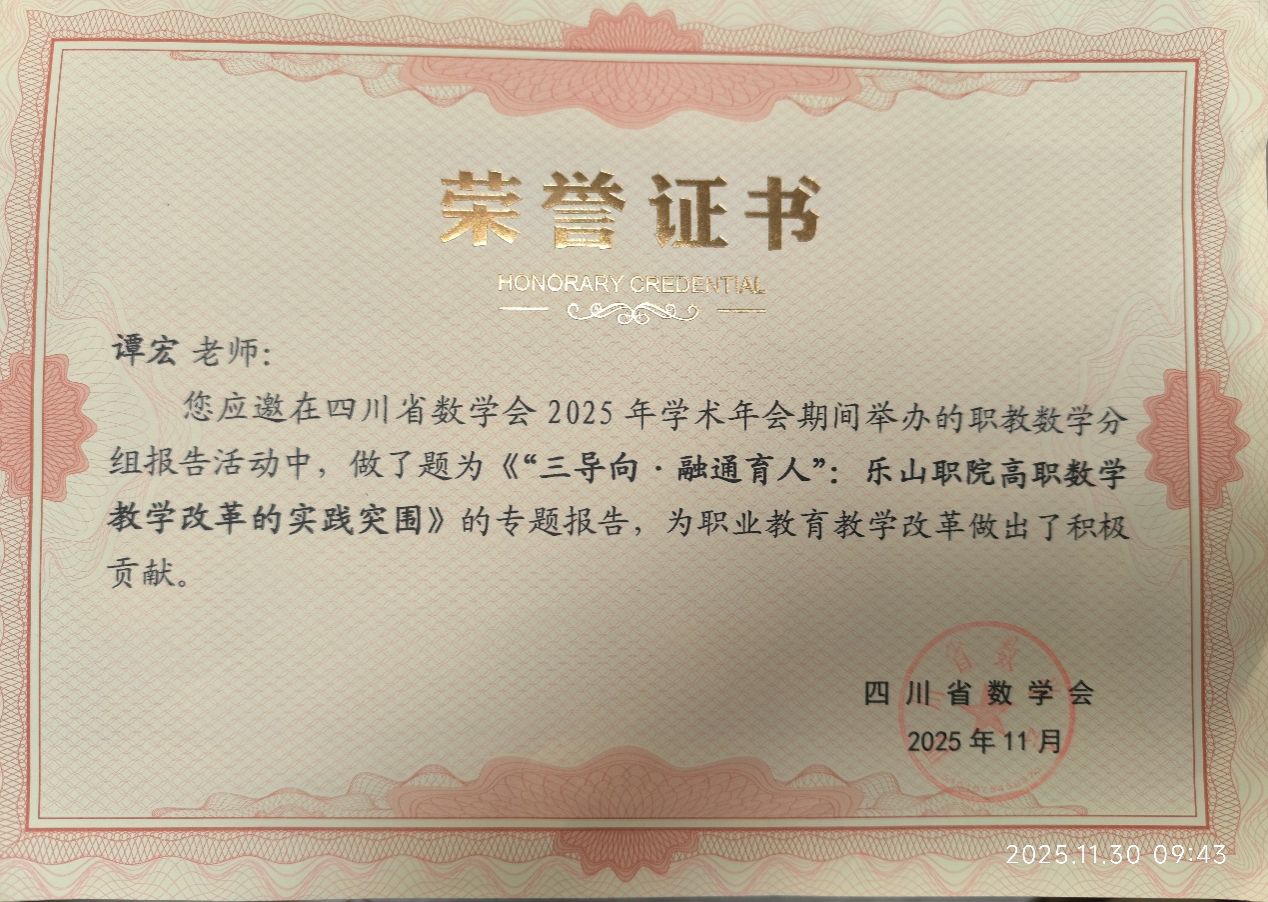 11月28日,四川省数学会2025年学术年会在成都理工大学隆重举行。本次年会首次增设了高职专场,共同探讨高职数学学科的前沿发展与教学改革的实践路径。素质教育学院党总支书记、院长谭宏代表学校在职教数学分组报告活动中作了《“三导向·融通育人”:乐山职院高职数学教学改革的实践突围》的专题报告。