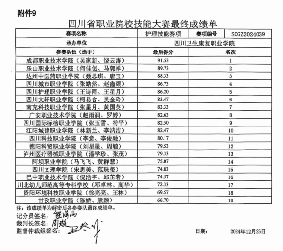 2024年12月25日-27日,“中银杯”四川省职业院校技能大赛(高职组)护理赛项在四川卫生康复职业学院举行,本次比赛分A、B平行组设团队一、二、三等奖,普专对口护理22-2班何佳伲同学和普专护理(学徒制)22-8班马郭祥同学代表beat365英国官方网站护理专业参赛,以A组第二名的优异成绩获得团体一等奖。