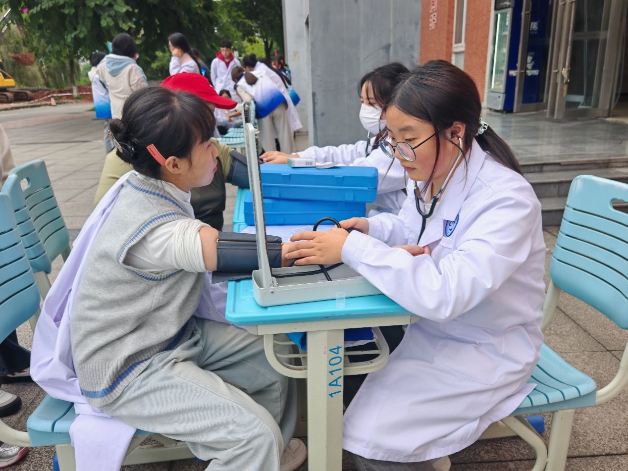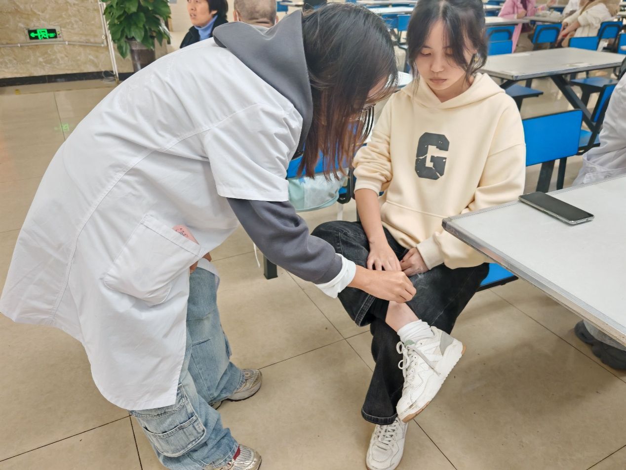 活动现场秩序井然,志愿者们分工明确、配合默契,以饱满的热情投入到各项服务中。免费血压测量区前,志愿者们细致记录数据,耐心解答师生关于血压健康的疑问;艾灸体验区内,淡淡的艾草香气氤氲飘散,志愿者们针对肩颈不适、疲劳乏力等问题,为身体不适的师生开展温和舒缓的艾灸调理,尤其关注长期伏案学习工作的师生,精准缓解其肩颈酸痛困扰;按摩区里,志愿者们运用课堂所学的推拿手法,动作娴熟、力道适中,精准揉捏穴位,让每位体验者都倍感放松,连连称赞 “手法专业,太舒服了”。