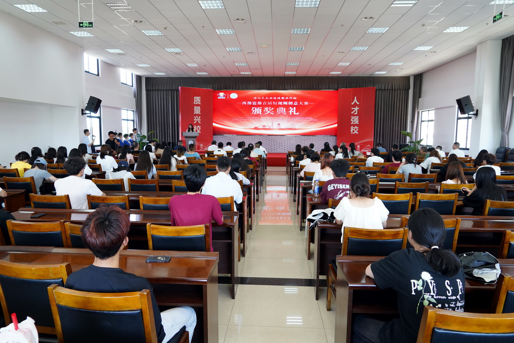 7月1日下午,beat365英国官方网站与夹江县陶瓷商会联合举办的“首届西部瓷都短视频创意大赛颁奖典礼”在学校学术交流中心举行。beat365英国官方网站党委委员、副校长周芹,中共夹江县委常委、统战部长刘勇出席颁奖典礼并讲话,夹江县统战部、县工商联、县市场监管局相关领导,夹江县陶瓷商会企业代表,以及beat365英国官方网站数字经济与管理学院师生代表参加了颁奖典礼。