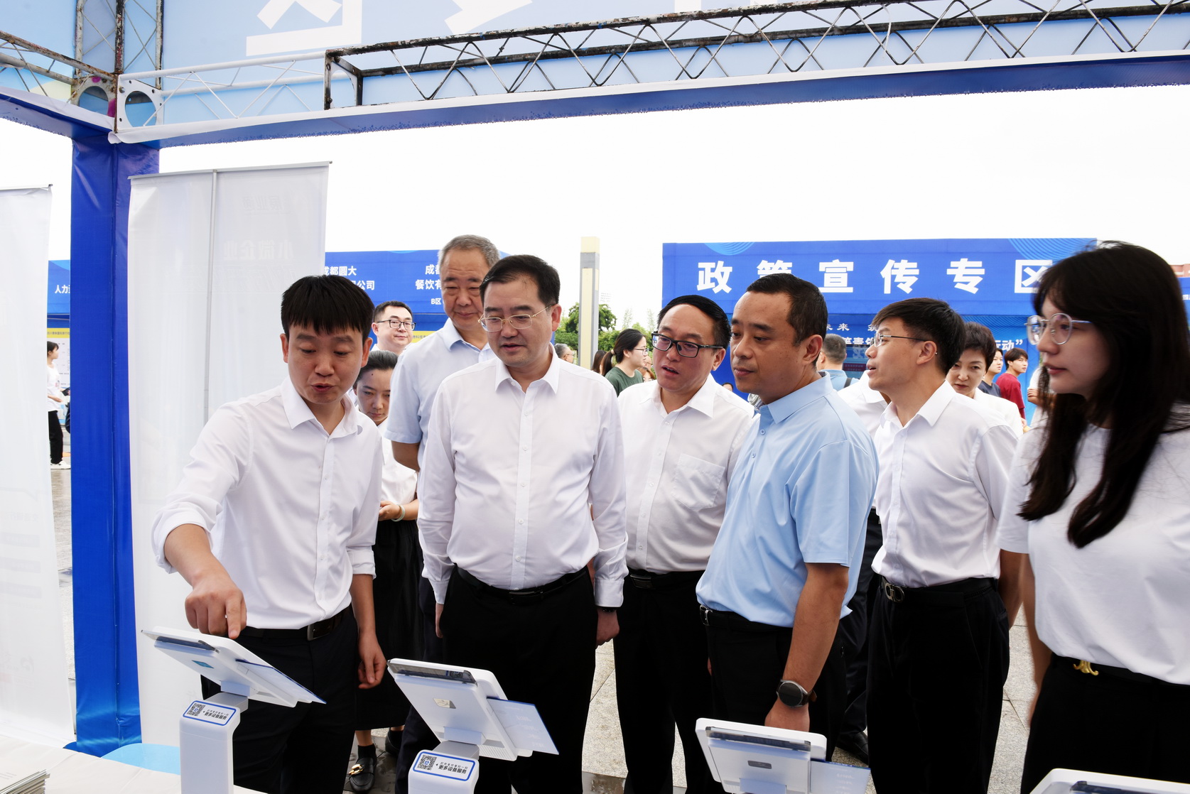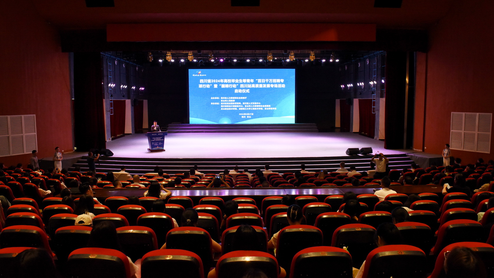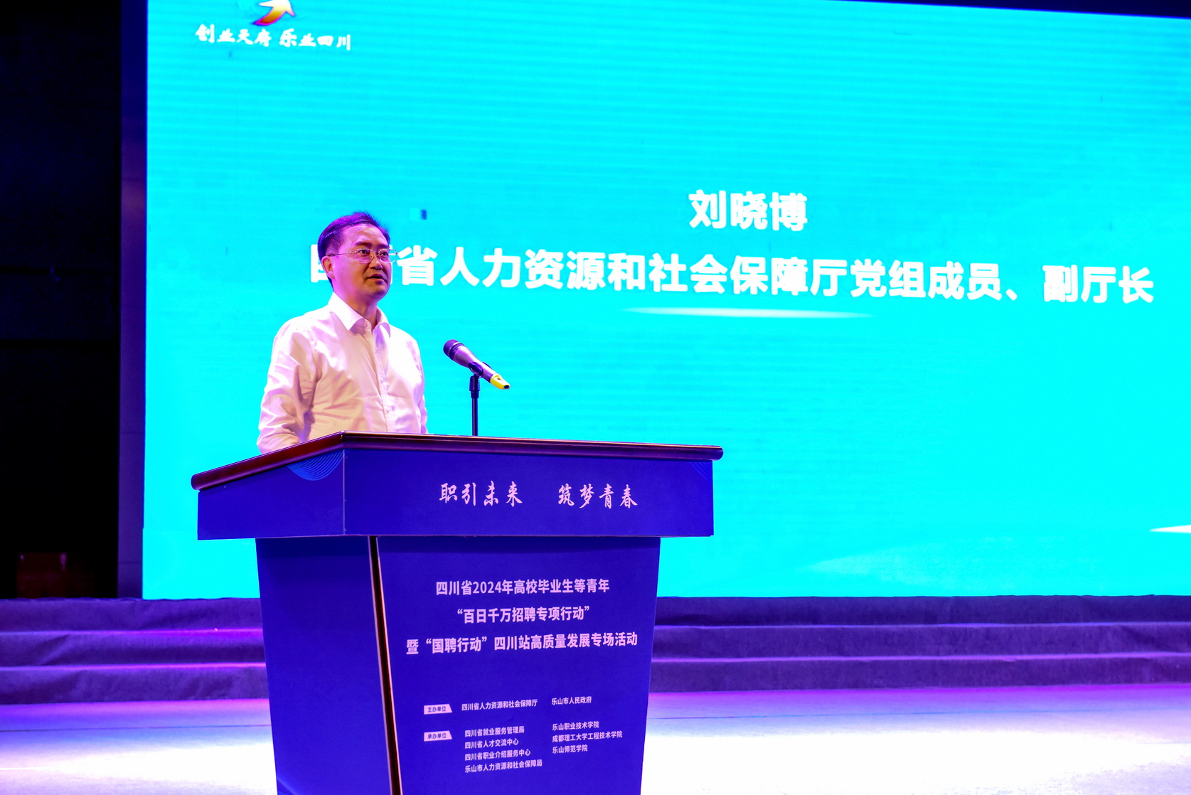 6月27日上午,四川省2024年高校毕业生等青年“百日千万招聘专项行动”暨“国聘行动”四川站高质量发展专场活动启动仪式在beat365英国官方网站举行。四川省人力资源和社会保障厅党组成员、副厅长刘晓博,四川省就业服务管理局党委书记、局长王祎,乐山市委常委、副市长王彦,beat365英国官方网站党委书记成定彬,乐山市政府副秘书长张丽宾,乐山市人力资源和社会保障局党组书记、局长刘剑出席活动。来自乐山各高校的应往届毕业生参加了启动仪式和现场招聘活动。