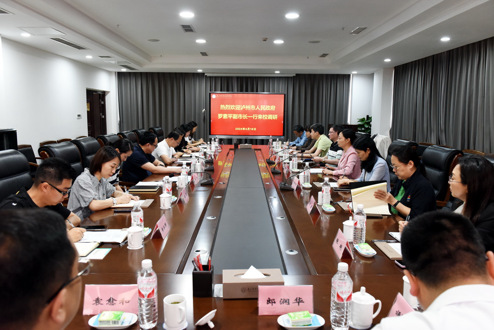 4月16日上午,泸州市人民政府副市长罗素平一行来学校开展工作调研。乐山市教育局党组成员、副局长马杰,学校党委书记成定彬,党委副书记、工会主席张佳陪同调研。