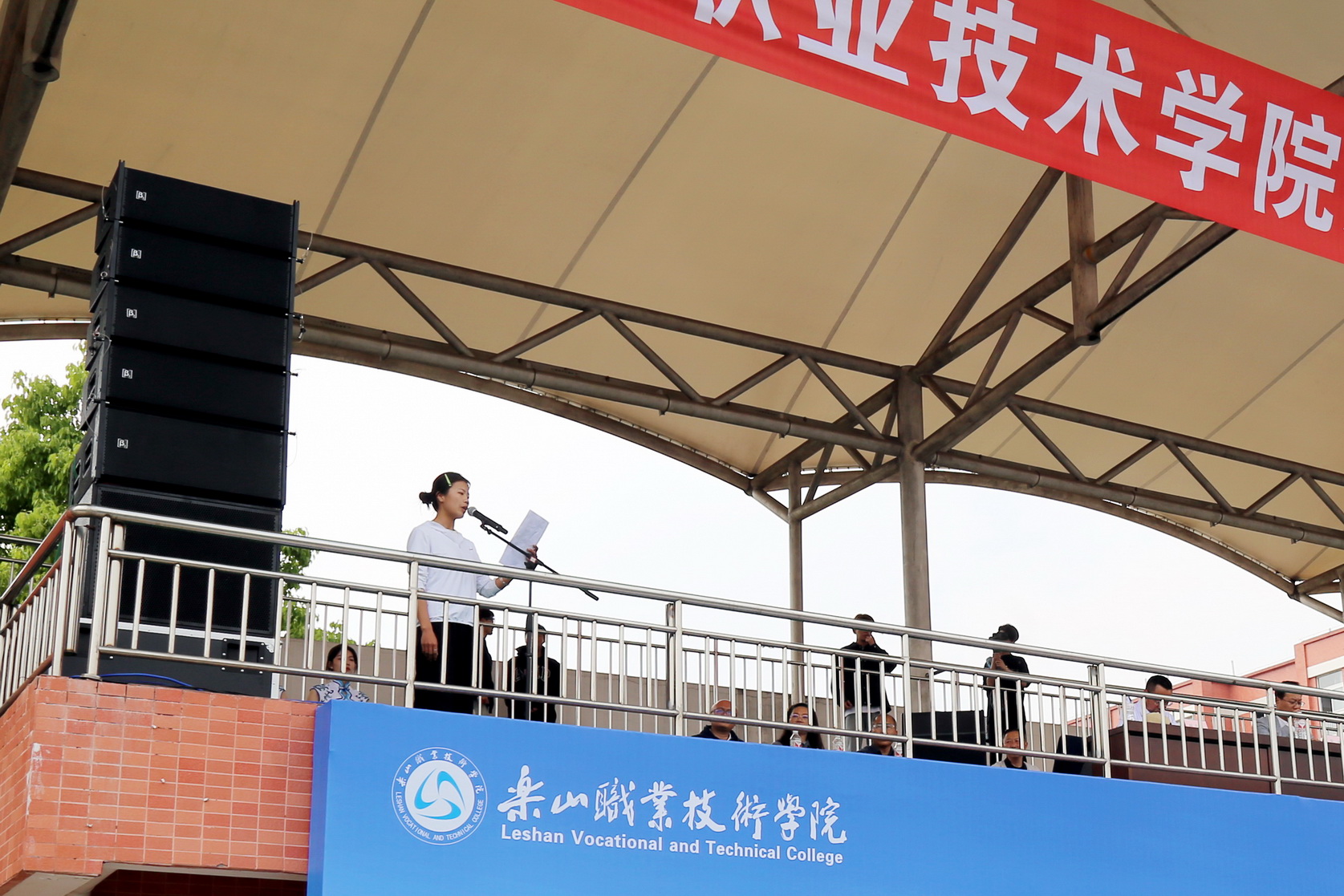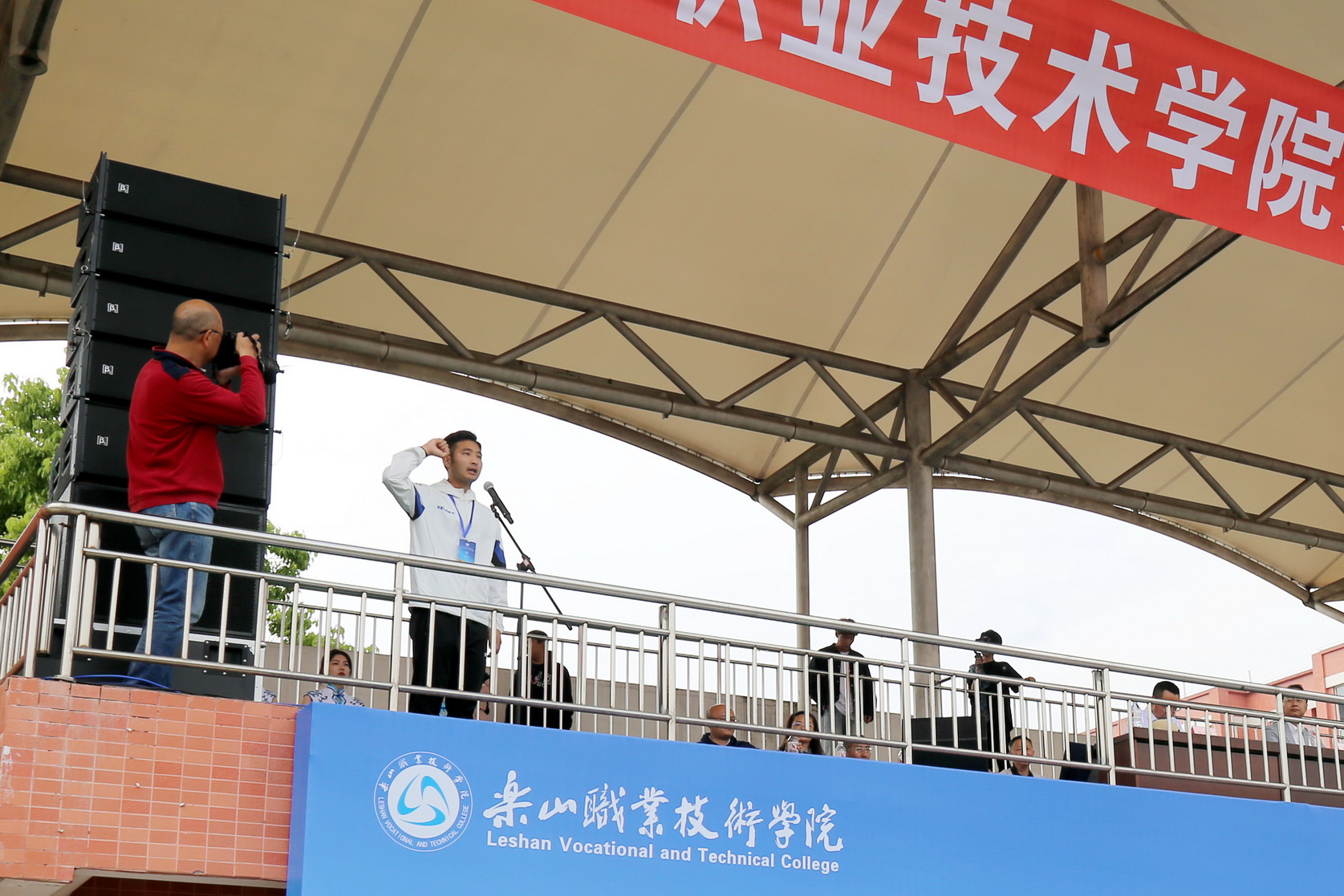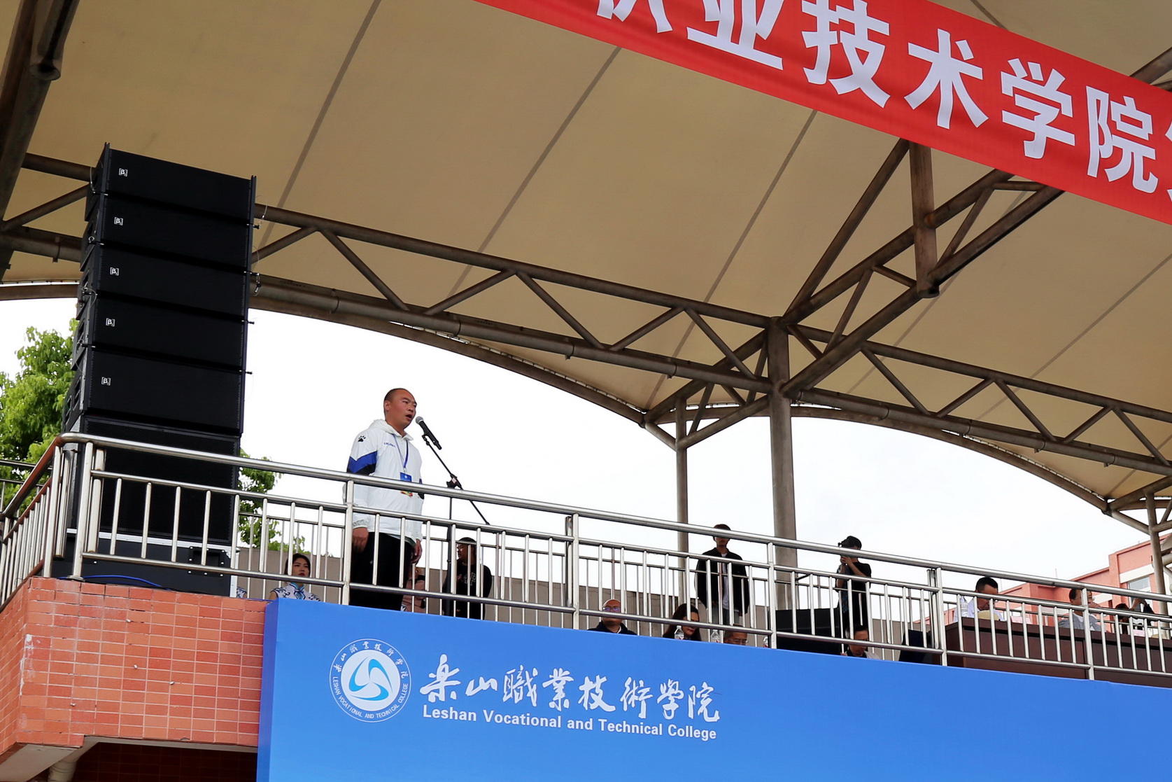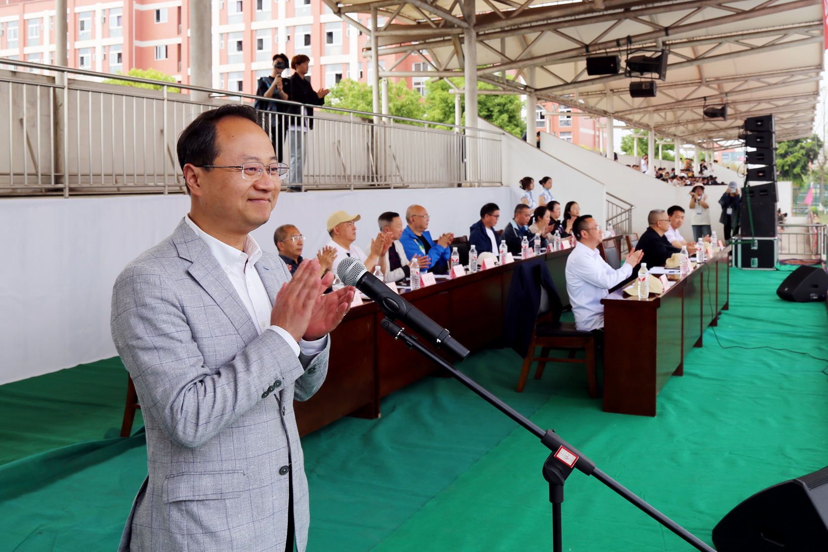学校党委委员、副校长张学河致辞。他希望同学们发扬体育精神,积极参与比赛,锻炼身体,磨练意志。在比赛中“合作、拼搏、团结、协同、进取”,取得优异成绩。他代表学校党政向本次运动会的召开表示热烈祝贺,向参与本次运动会的运动员、裁判员、志愿者和广大师生员工表示诚挚的问候,向为运动会辛勤付出的工作人员表示衷心的感谢,并预祝本届运动会取得圆满成功。