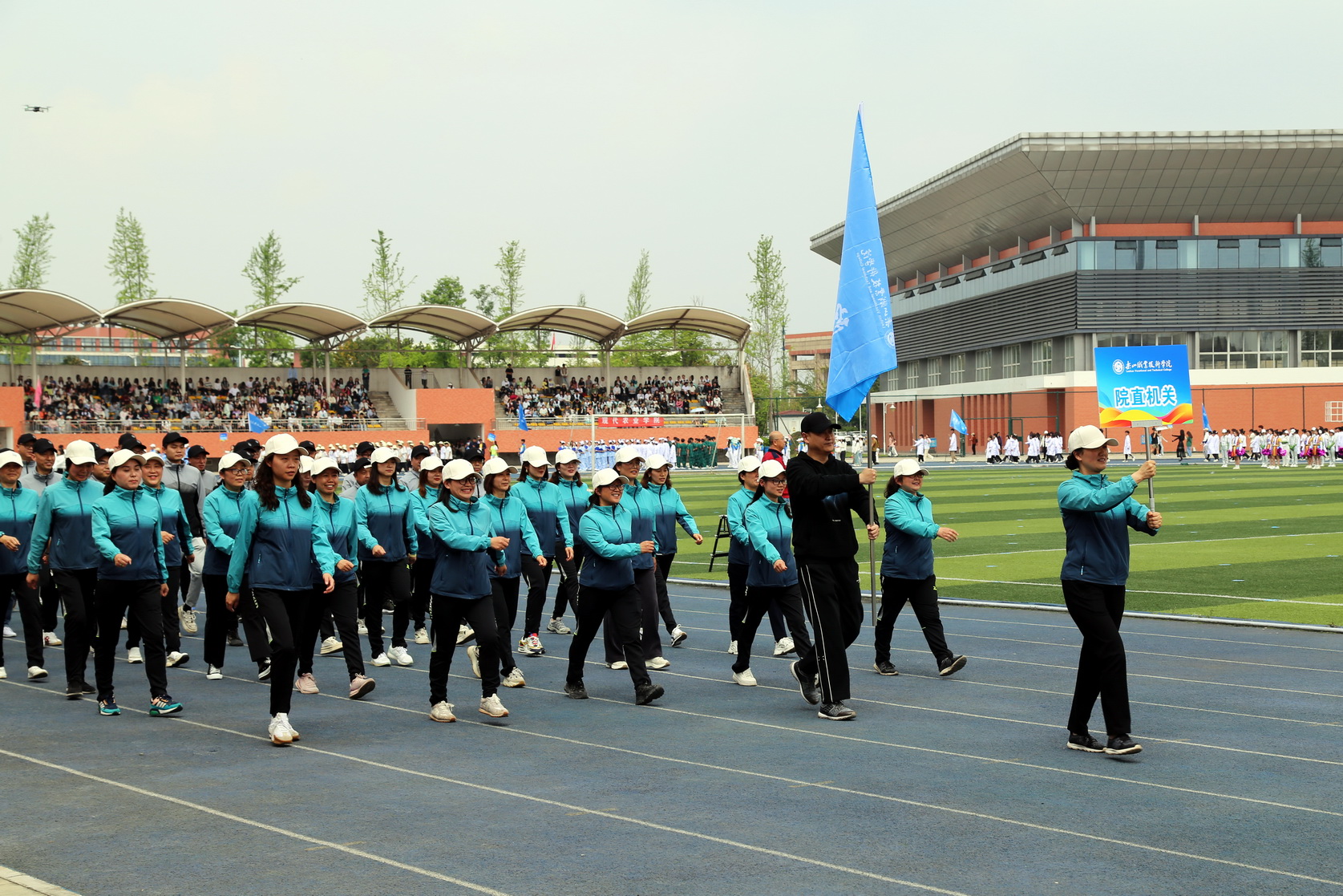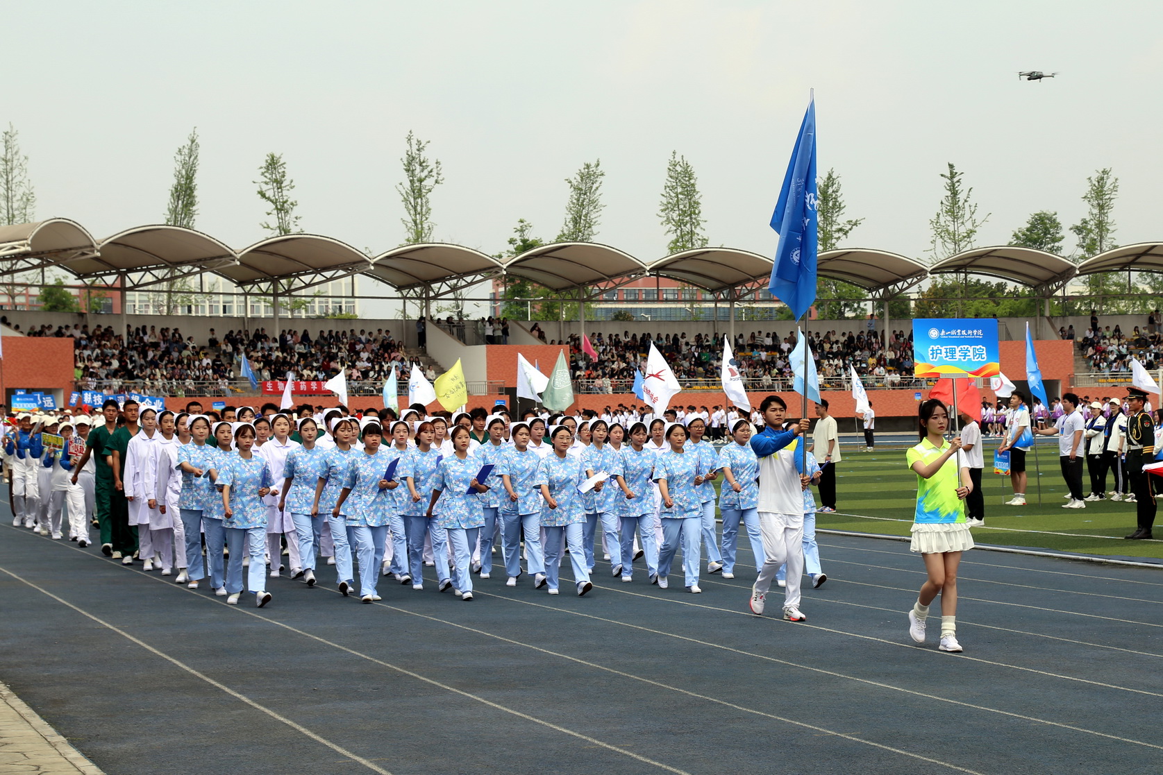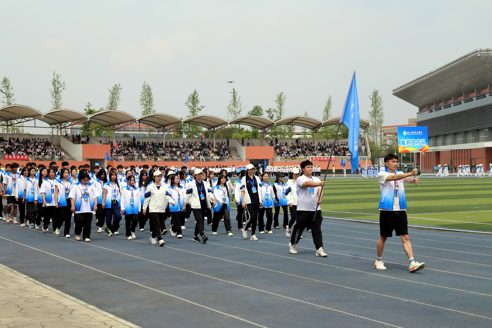 随后,在国旗、校旗、会旗的引领下,裁判员方队、机关代表队、各二级学院方队和留学生方队依次入场,他们身着统一的运动服装,踏着《运动员进行曲》的节拍,迈着整齐的步伐迈进运动场。每个方阵都精心设计了独特的口号和表演,展现了各自学院的专业特色和团队精神,展示了昂扬向上的青春活力和朝气蓬勃的精神风貌。