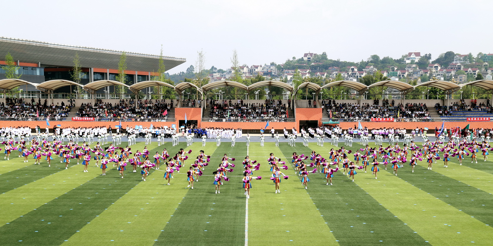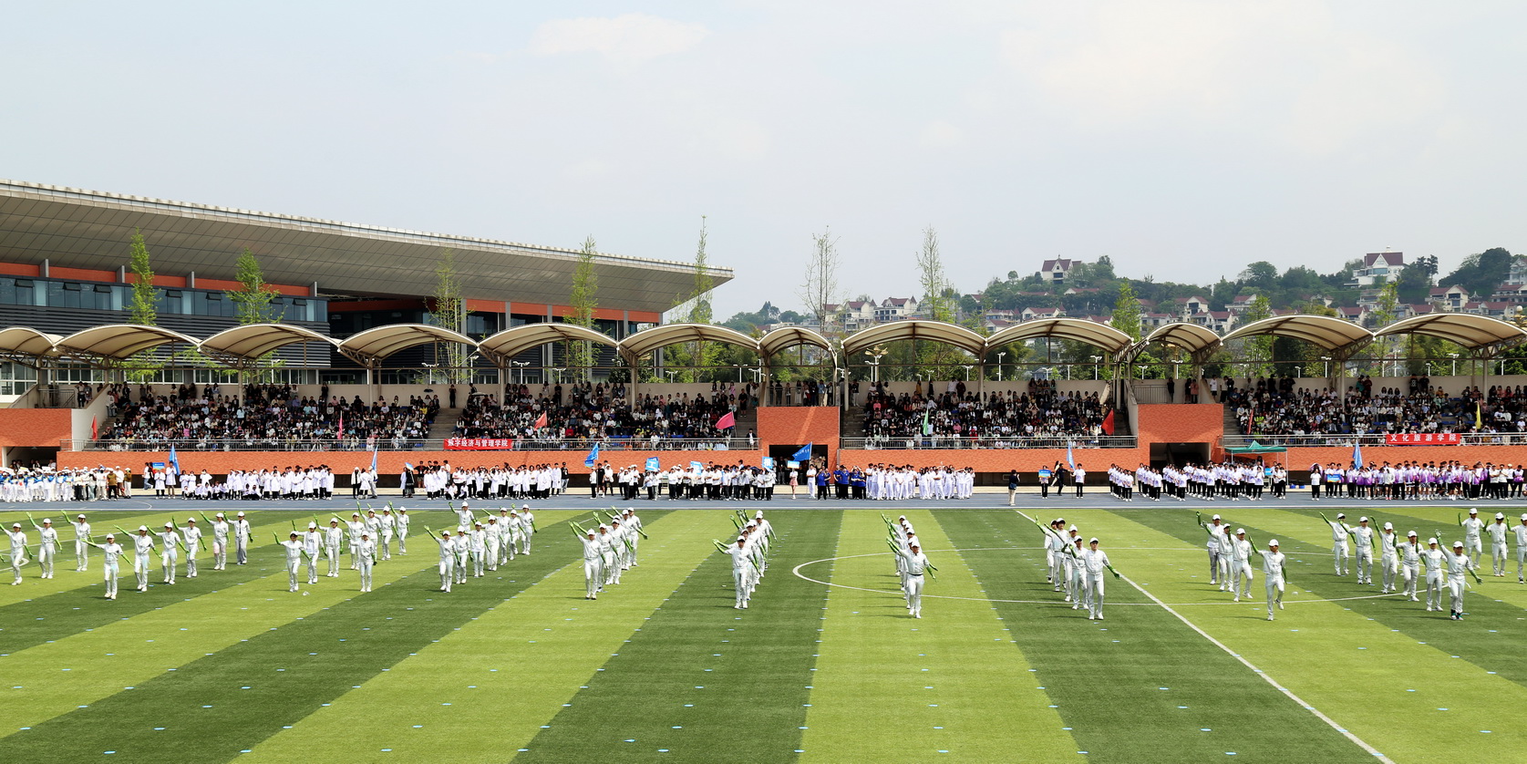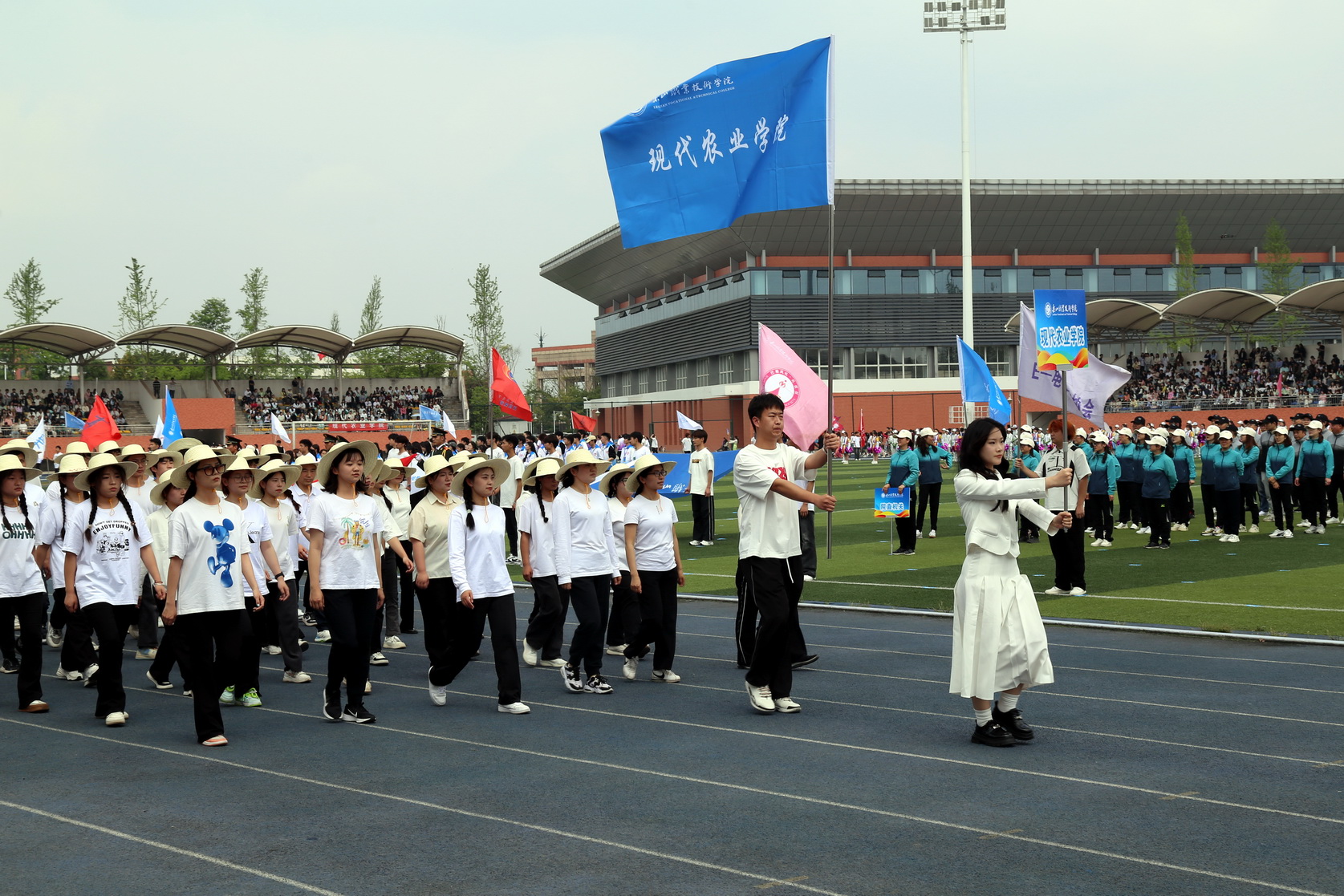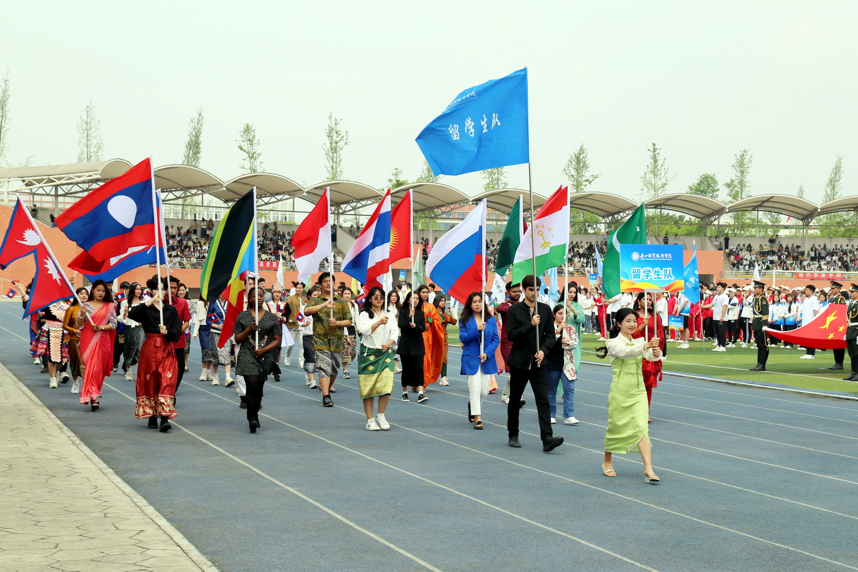随后,在国旗、校旗、会旗的引领下,裁判员方队、机关代表队、各二级学院方队和留学生方队依次入场,他们身着统一的运动服装,踏着《运动员进行曲》的节拍,迈着整齐的步伐迈进运动场。每个方阵都精心设计了独特的口号和表演,展现了各自学院的专业特色和团队精神,展示了昂扬向上的青春活力和朝气蓬勃的精神风貌。