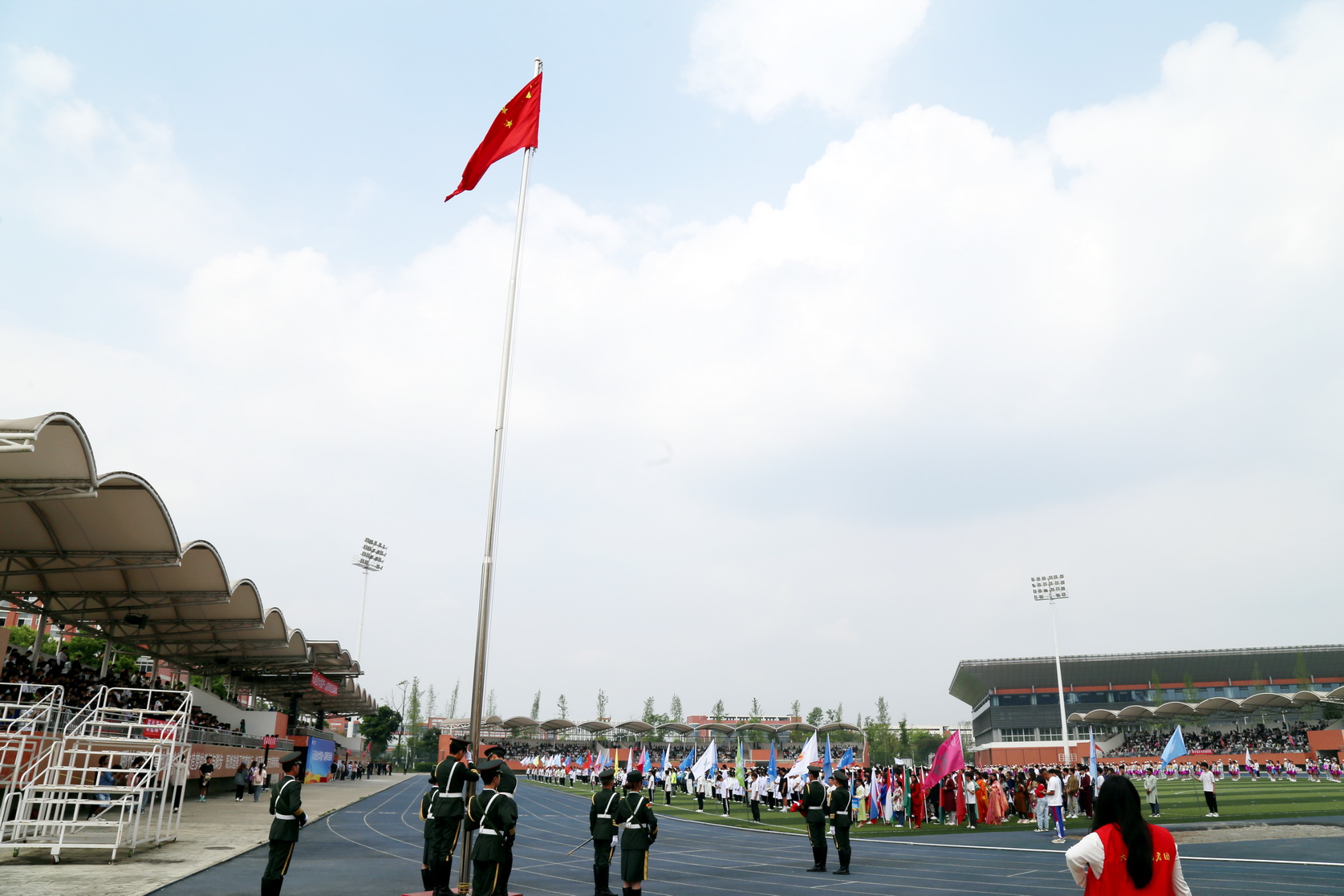 入场式后,庄严的《国歌》声响起,在全体师生的注目中,国旗冉冉升起。裁判员代表、教职工运动员代表、学生运动员代表宣誓。