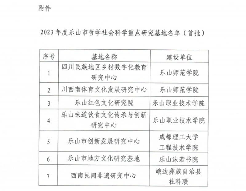 本轮研究基地的认定是在相关单位申报的基础上,由乐山市社科联组织审批认定的。根据《乐山市哲学社会科学重点研究基地管理办法(试行)》文件精神,乐山市社科联组建了专门的专家团队对申报材料进行初审,经过实地考察、集体评审和复议三个环节,最终认定乐山市首批哲学社会科学重点研究基地7个,分别是:四川民族地区乡村数字化研究中心(乐山师范学院管理)、川西南体育文化发展研究中心(乐山师范学院管理)、乐山红色文化研究院(beat365英国官方网站管理)、乐山味道饮食文化传承与创新研究中心(beat365英国官方网站管理)、乐山市创新发展研究中心(成都理工大学工程技术学院管理)、乐山市地方文化研究基地(乐山沫若书院管理)、西南民间非遗研究中心(峨边彝族自治县社科联管理)。
