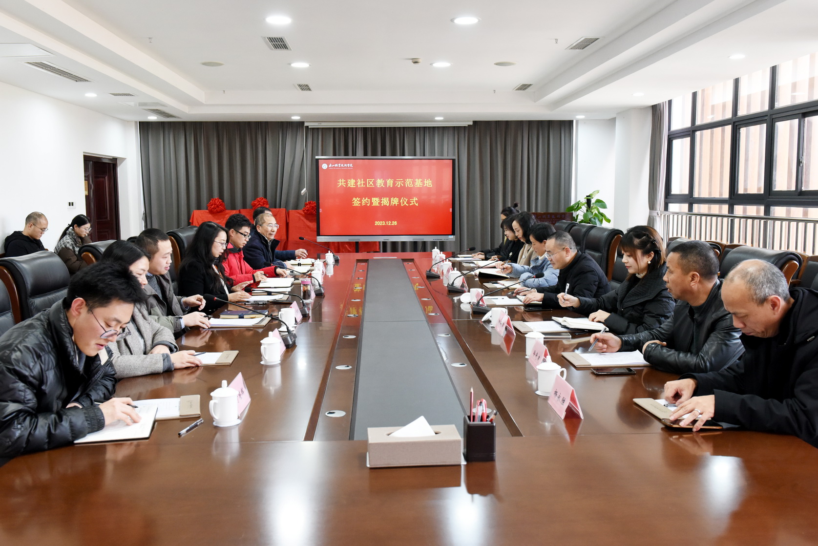 12月26日下午,校地共建“社区教育示范基地”签约揭牌仪式在学术交流中心2001会议室举行。学校党委委员、副校长周芹,乐山市海棠街道党工委书记袁梅,苏稽镇党委书记周健,相关街道和社区负责人,学校法规处、继续教育学院、马克思主义学院相关负责人参加。