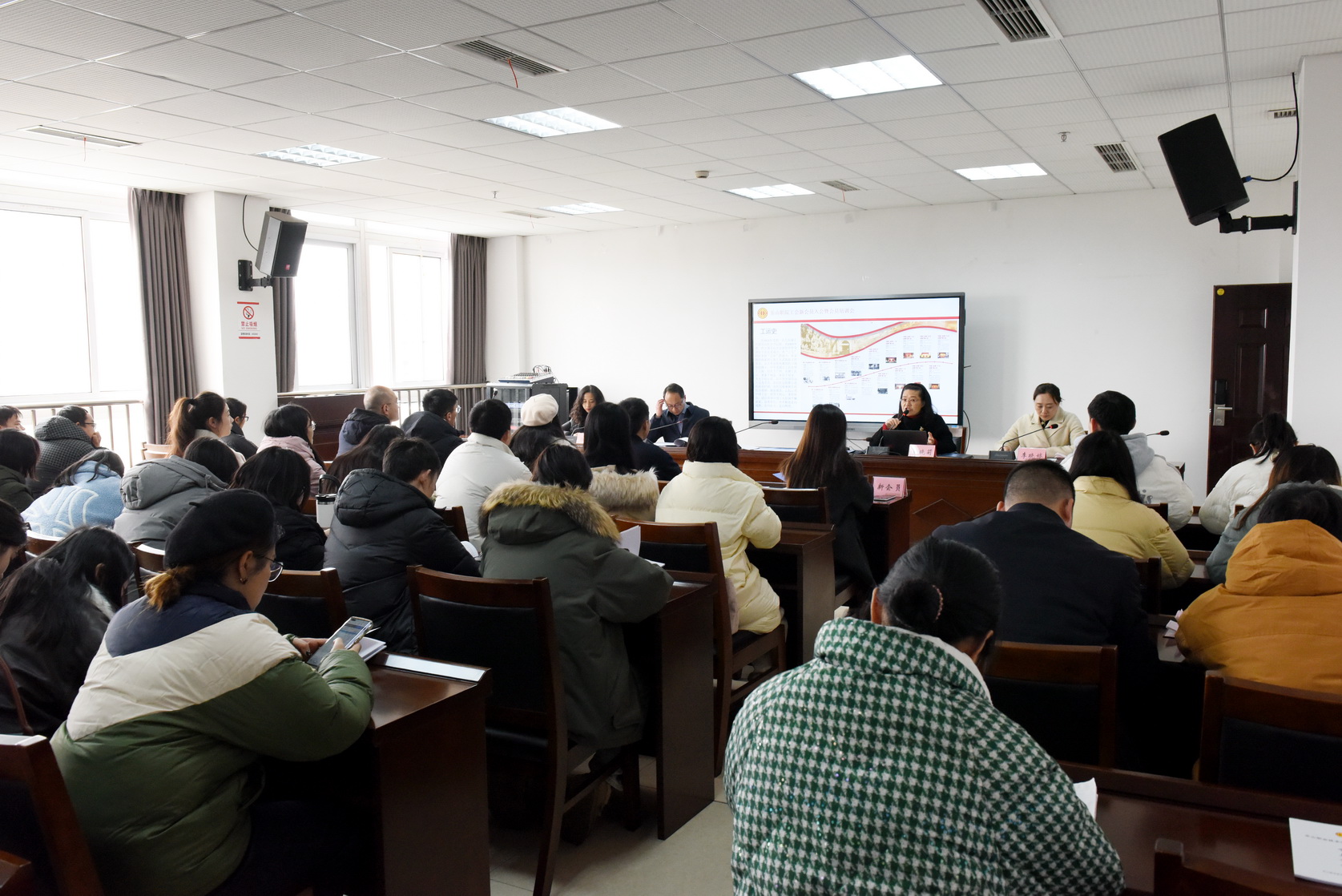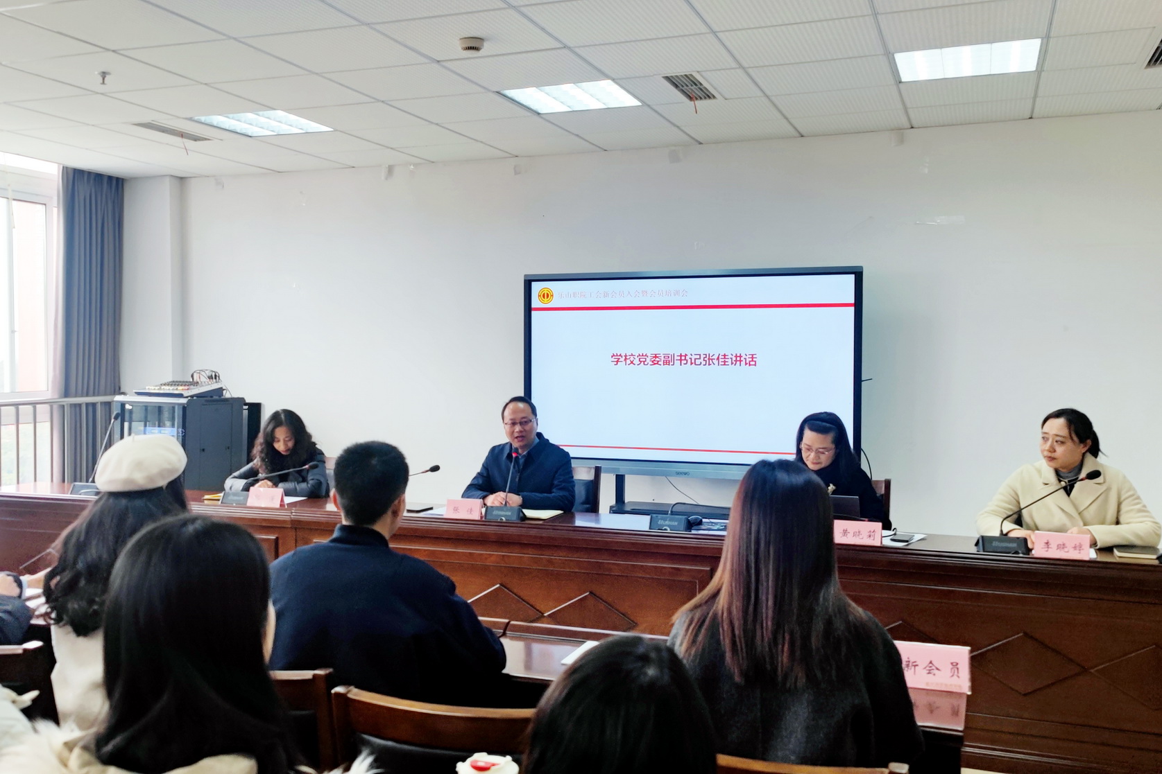 2023年12月22日下午,学校工会在行政楼401会议室开展了工会新会员入会暨会员培训会。校党委副书记张佳出席培训会并讲话,校工会副主席、妇联主席黄晓莉,审计处处长、工会经审委主任郭蓬,各二级工会主席,工会干事及45名新入职教师参加了培训会,会议由校工会组织委员李晓婷主持。