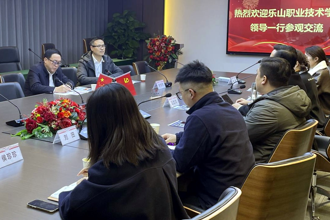 会议期间,成定彬一行赴宿迁电子商务产业园调研,参观考察了宿迁电子商务产业园、京东客服中心、京东校园馆运营总部、京彩(江苏)科技有限公司等企业。在京彩(江苏)科技有限公司,公司总裁兼党委书记汪世龙、董事长张前程等与成定彬就产教融合、校企合作、实习就业和产业学院建设进行了深入交流。双方一致同意以共建京东产业学院为契机,加深校企合作,把京东先进的技术和服务引入乐山,打造服务人才培养和服务地方数字产业的标杆,把校企合作推向新阶段。