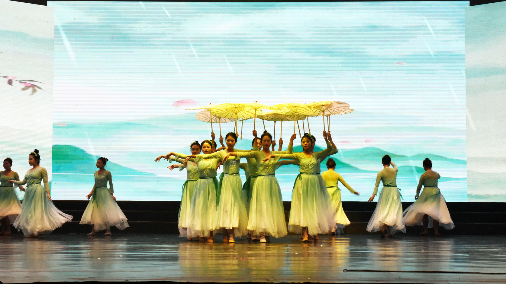 舞蹈《雨涧春行图》以江南山水为题,以诗入舞,在浸透自然与清新的烟雨下,碧衣携青伞,身临其境,步入微雨的春景。