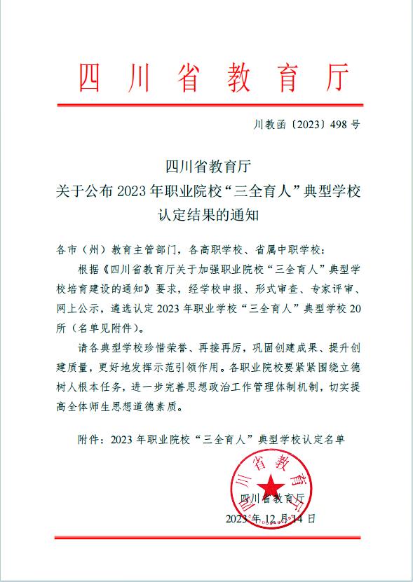 近日,四川省教育厅公布2023年职业院校“三全育人”典型学校认定结果,beat365英国官方网站被认定为2023年省级职业教育“三全育人”典型学校。这是学校自2021年入选四川省“三全育人”综合改革试点高校以来取得的重要突破,充分展示了学校在“三全育人”综合改革方面取得的阶段性成效。