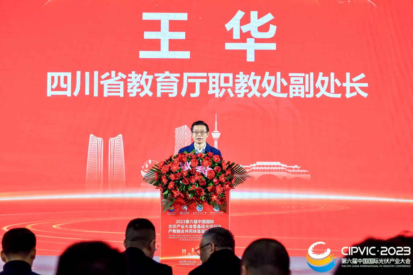 四川省教育厅职教处副处长王华致辞。他表示,四川省高度重视产教融合工作,在全国首创产教融合校企双基地制度,着力安排产教融合示范项目,有力推动了先进材料、电子信息等四川省优势产业发展。共同体作为深化现代职业教育体系建设改革战略载体的一翼,汇聚产教科优质资源,能有效推动各类主体深度参与职业教育,将职业教育与行业进步、产业转型、区域发展捆绑在一起,有效破解人才培养供给侧与产业需求侧匹配度不高的问题,为行业提供稳定的人力、资源和技术支撑。希望共同体努力形成一批可复制可推广的新经验、新范式、新案例,把共同体做深做实,努力为“以中国式现代化全面推进中华民族伟大复兴”筑牢晶硅光伏行业科技、教育和人才之基作出新的更大贡献。