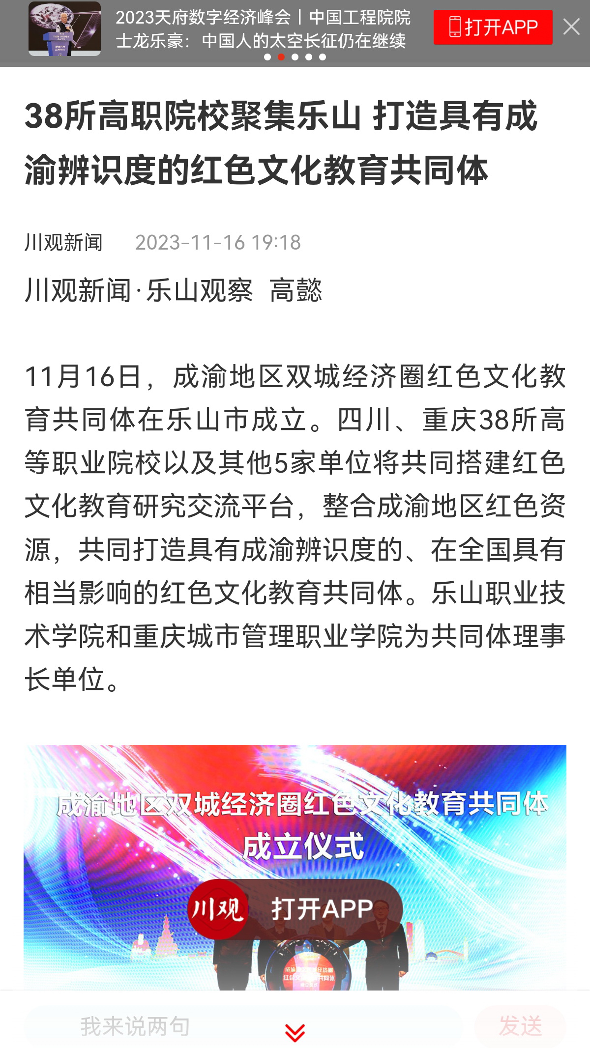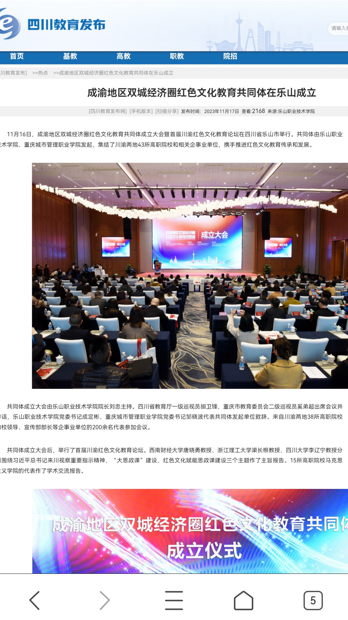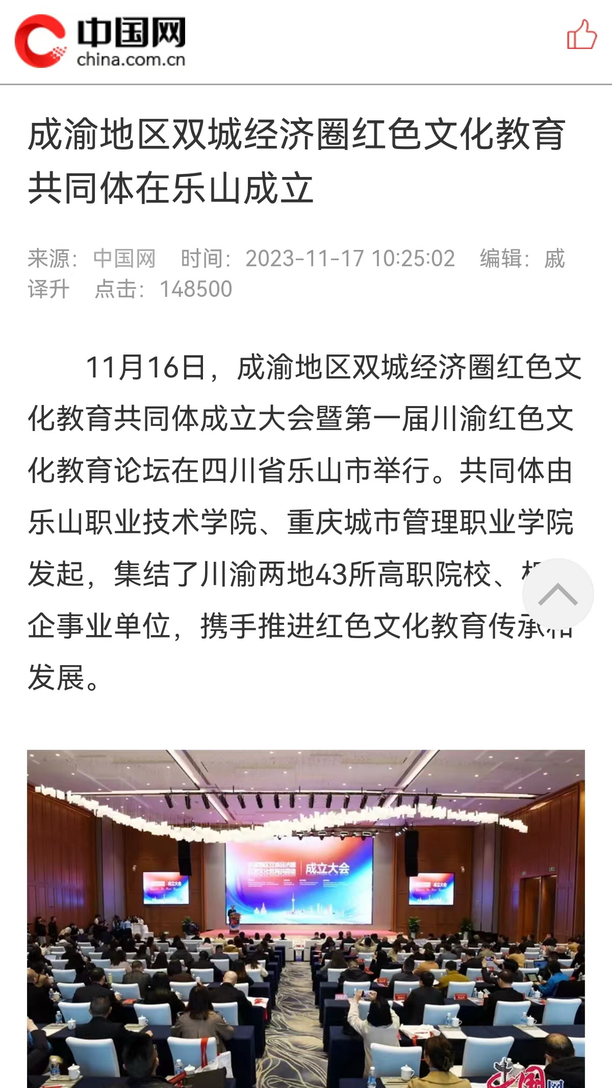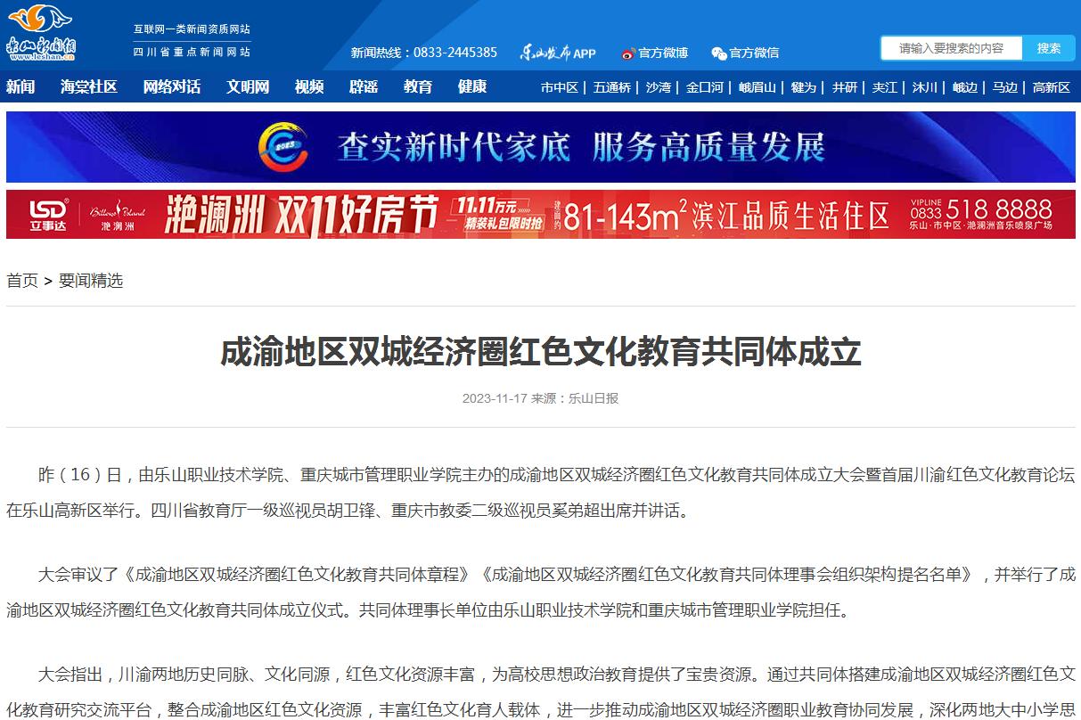 11月16日,成渝地区双城经济圈红色文化教育共同体成立大会暨首届川渝红色文化教育论坛在四川省乐山市举行。共同体由beat365英国官方网站、重庆城市管理职业学院发起,集结了川渝两地43所高职院校和相关企事业单位,携手推进红色文化教育传承和发展。