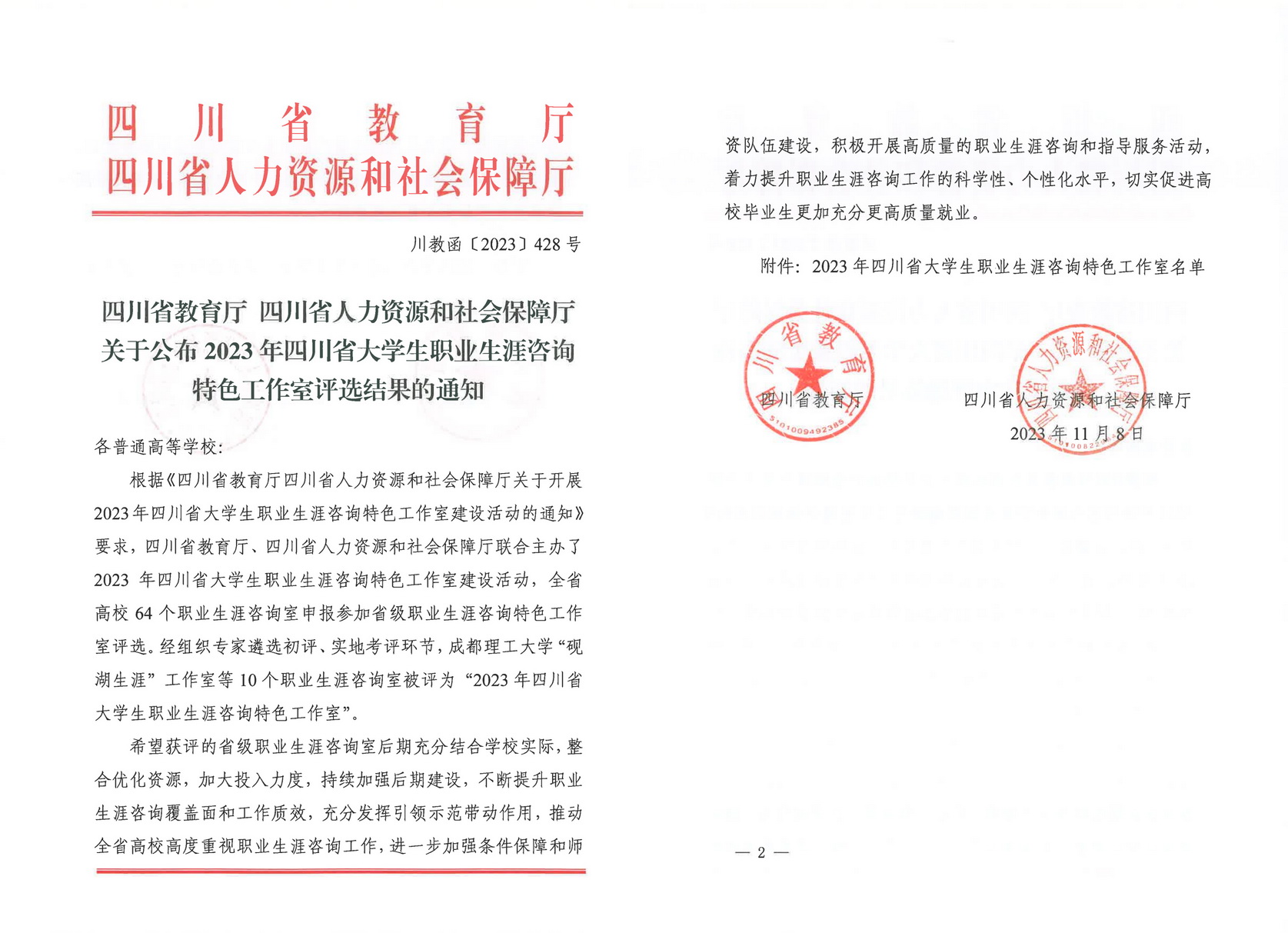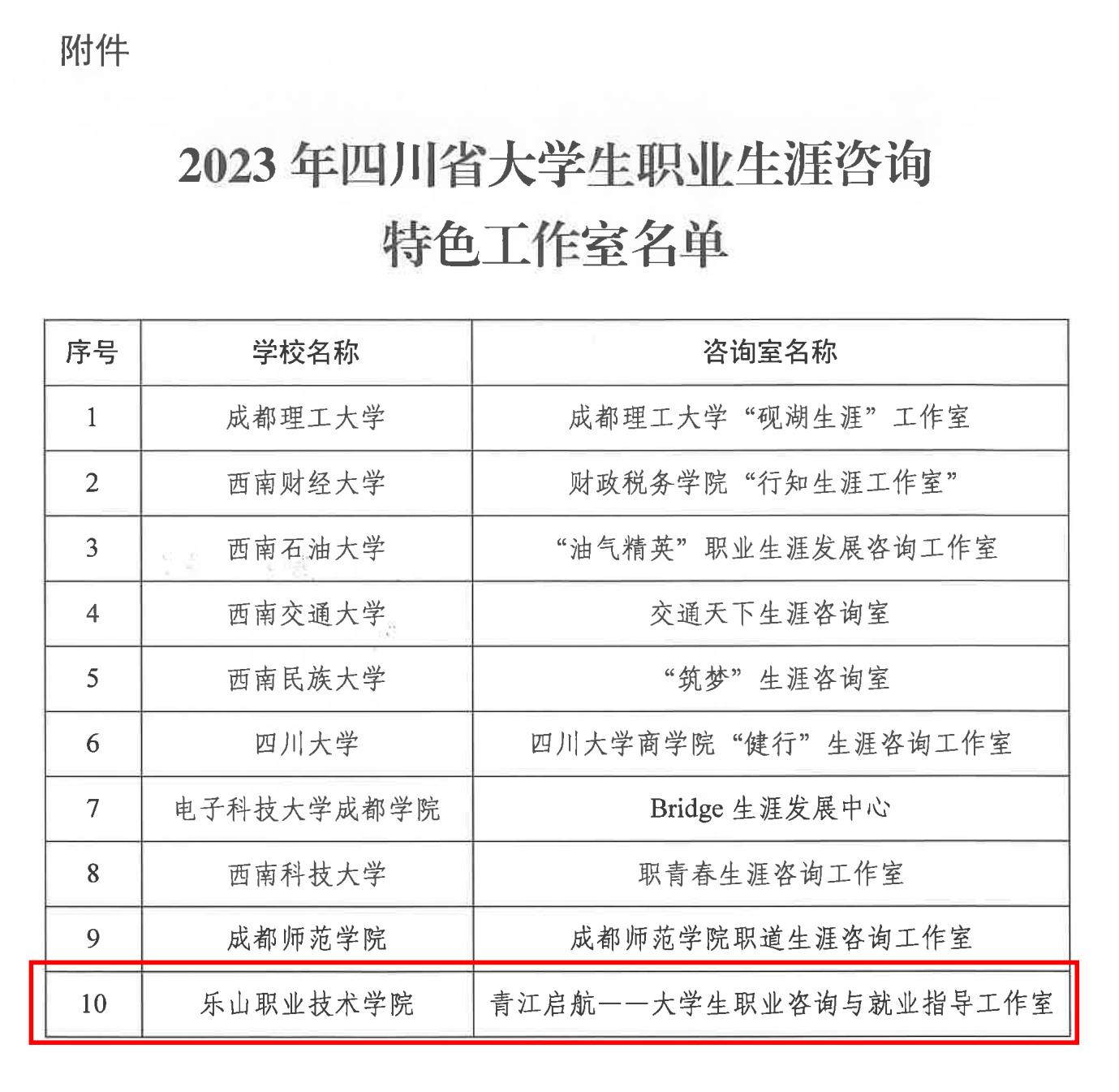 11月8日,四川省教育厅、四川省人力资源和社会保障厅发文公布“2023 年四川省大学生职业生涯咨询特色工作室评选结果”,beat365英国官方网站“青江启航——大学生职业咨询与就业指导工作室”上榜,是首批省级大学生职业生涯咨询特色工作室中唯一入选的高职专科学校。