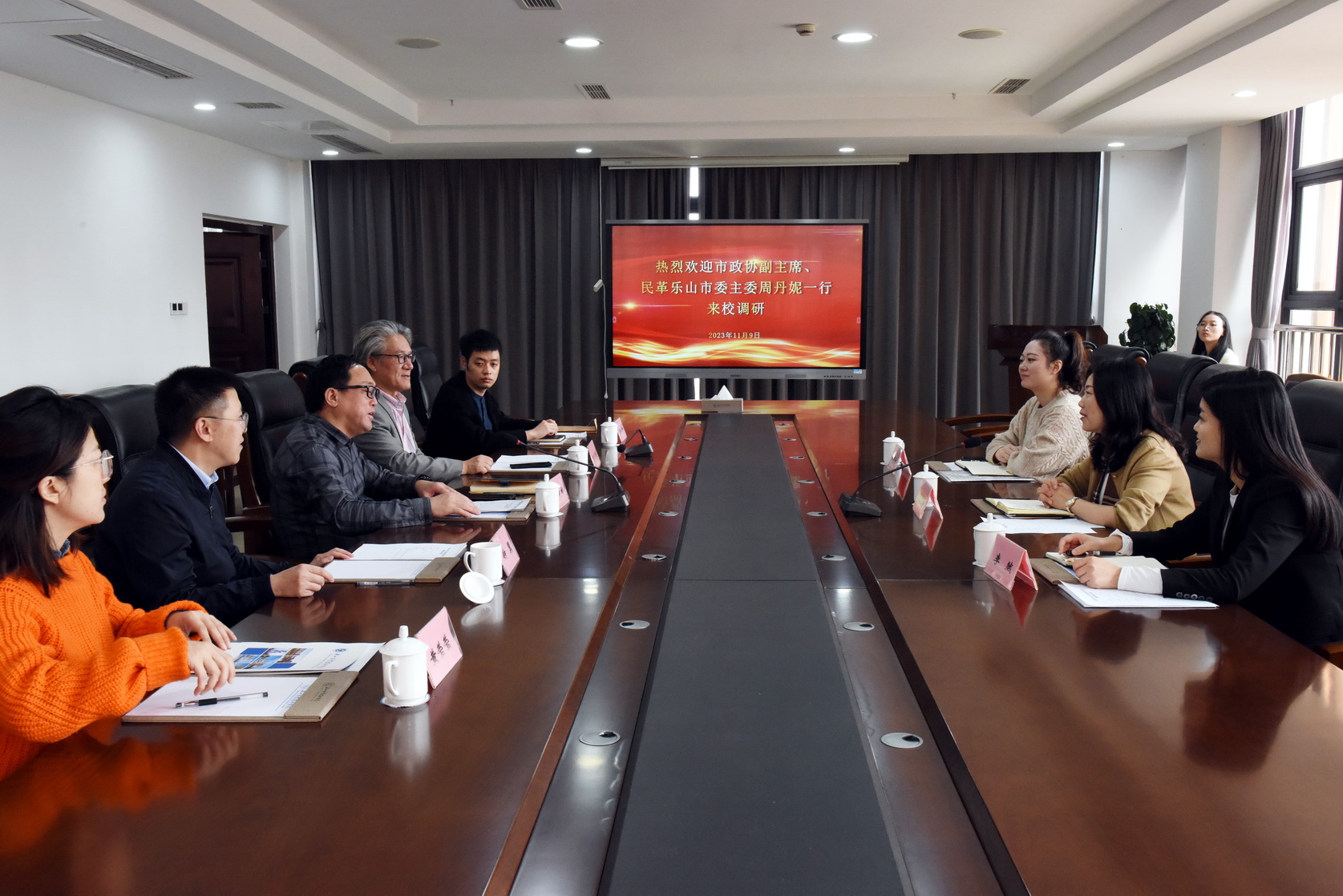 11月9日上午,乐山市政协副主席、民革乐山市委主委周丹妮一行来学校开展调研工作,调研座谈会在交流中心2001会议室进行。学校党委书记成定彬,党委副书记、工会主席陈芝海,宣传部(统战部)负责人,学校民革党派成员参加座谈会,陈芝海主持会议。