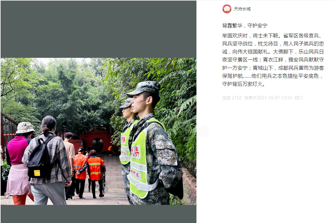 在国庆黄金周期间,学校民兵连执勤队员坚守景区各点位,恪尽职守、履职尽责,良好的军容军姿和饱满热情的服务受到了上级武装部门、景区管委会的高度肯定,游客们纷纷点赞。国庆期间学院民兵连执勤事迹被四川省军区“天府长城”栏目收录,誉为“大佛脚下,乐山民兵日夜坚守景区一线。”