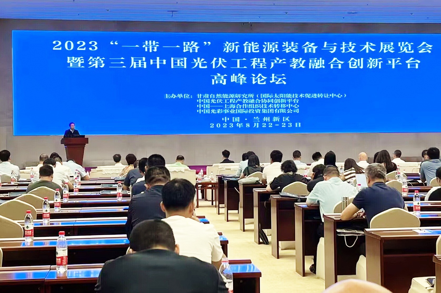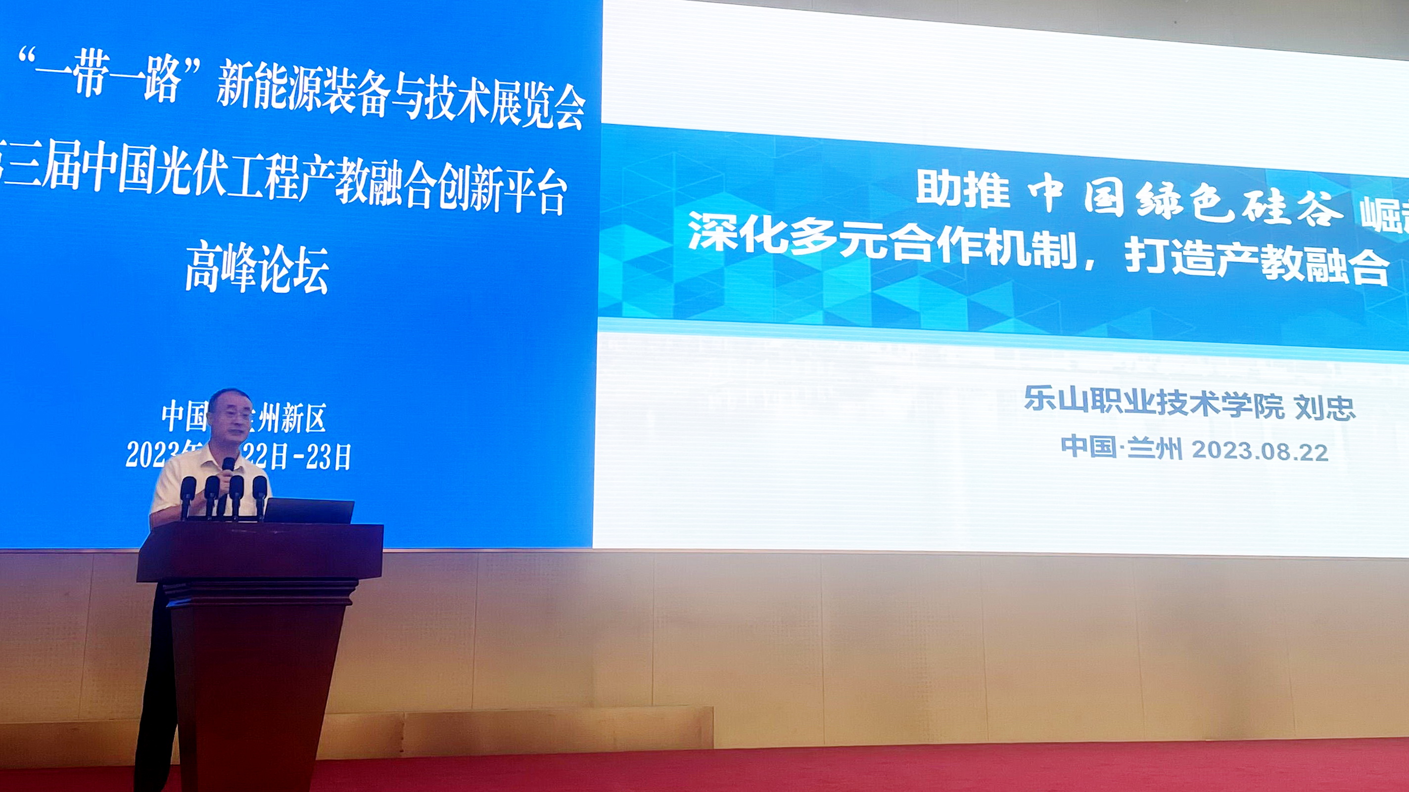 2023年8月22日,2023“一带一路”新能源装备与技术展览会暨第三届中国光伏工程产教融合创新平台高峰论坛在兰州新区开幕。校长刘忠受邀参加并作“助推中国绿色硅谷崛起,深化多元合作机制,打造产教融合乐山模式”专题报告。
