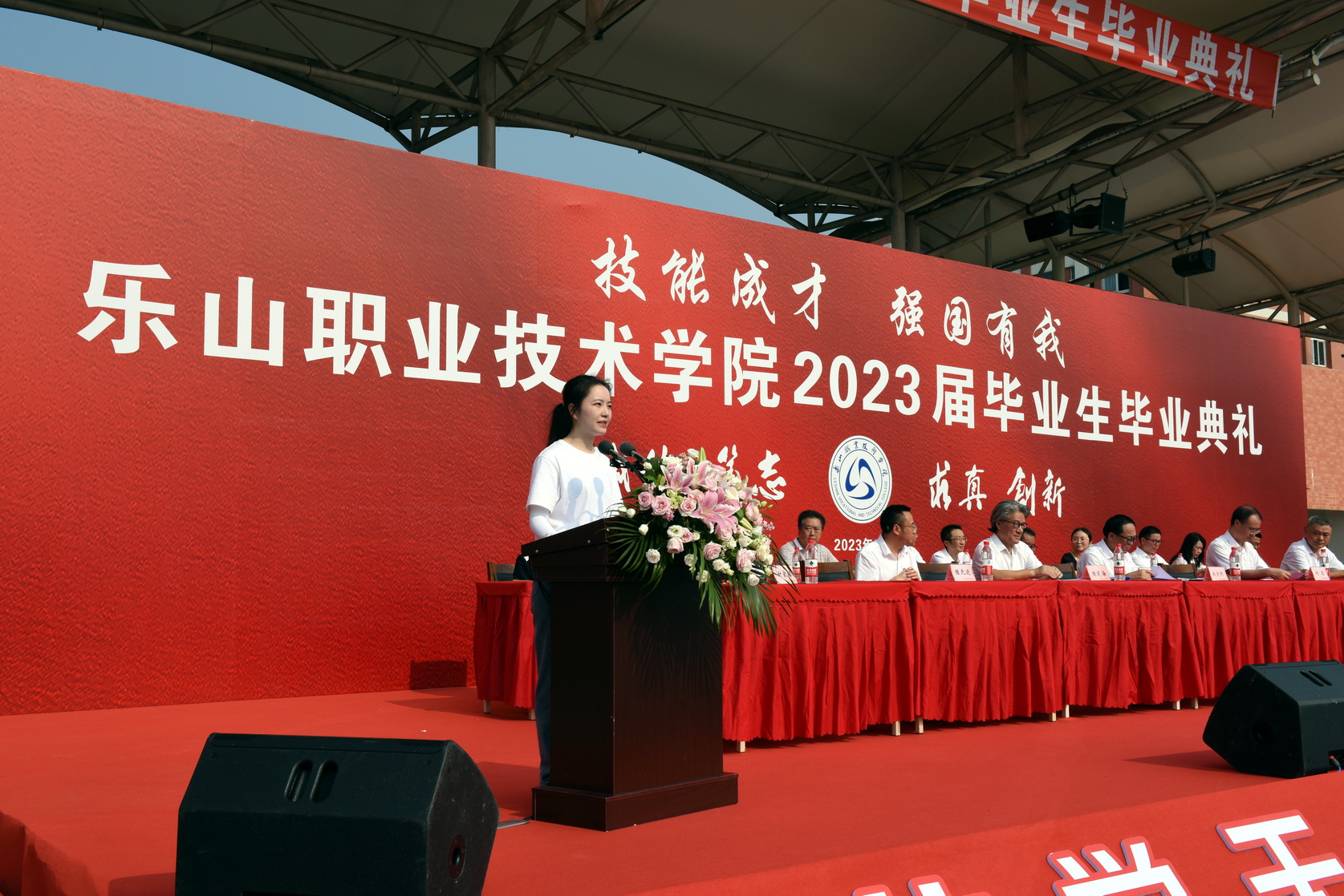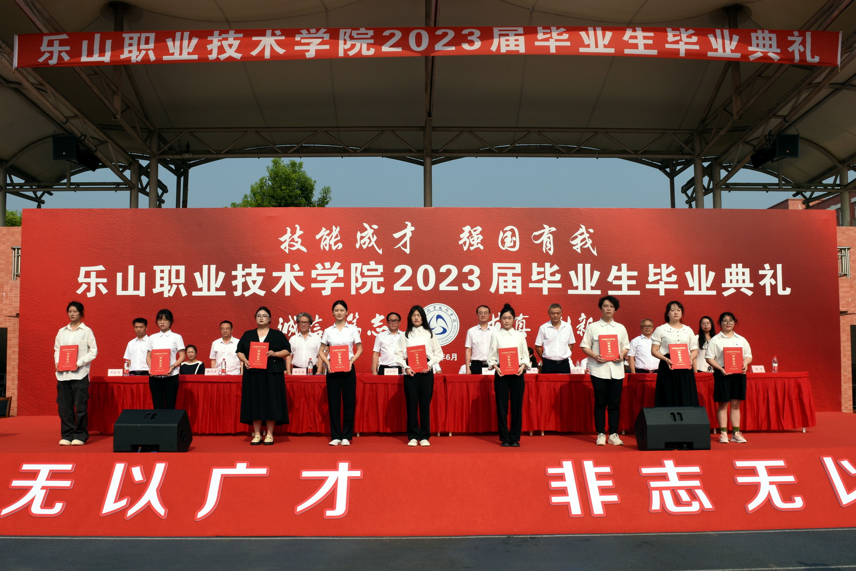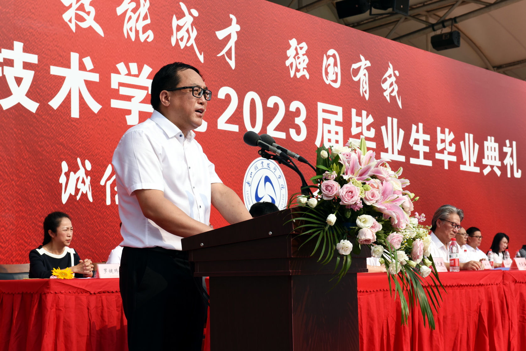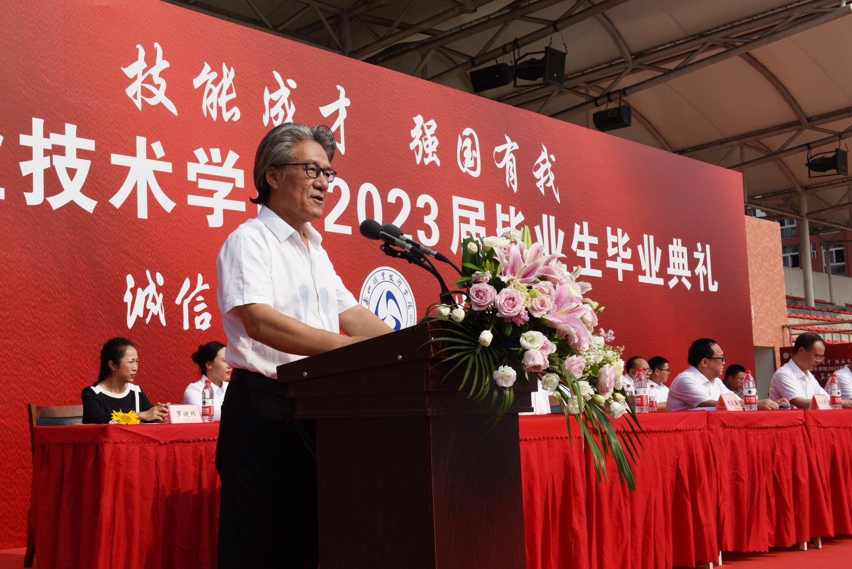 学校党委书记成定彬致辞,他送给毕业生三个“希望”,一是希望大家要有担当的“志气”;二是希望大家要有正直的“骨气”;三是希望大家要有自信的“底气”。叮嘱2023届毕业生们一定要以“读万卷书、行万里路”的觉悟,用思想和行动去丈量这个世界,牢记“诚信、笃志、求真、创新”的校训,成为一名优秀的“能工巧匠和大国工匠”。