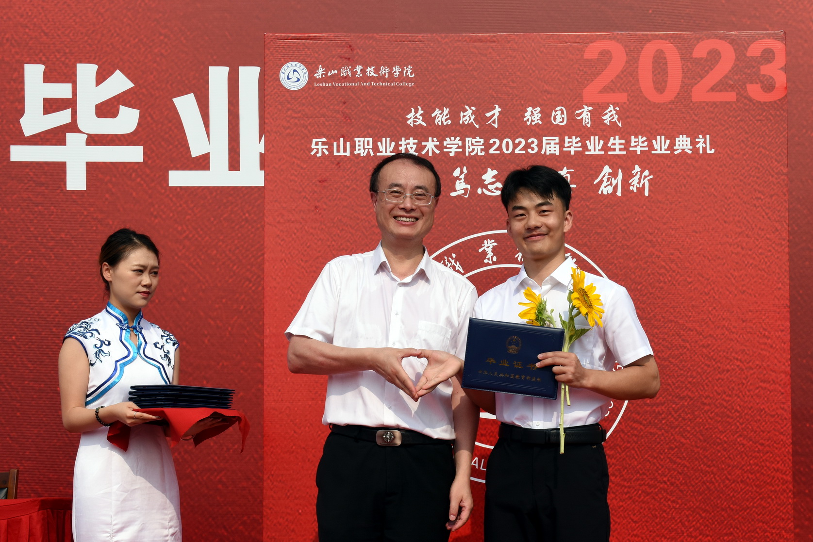 校长刘忠为毕业生代表颁发了毕业证并合影留念,这份特殊的荣誉将镌刻他们的青春记忆中。