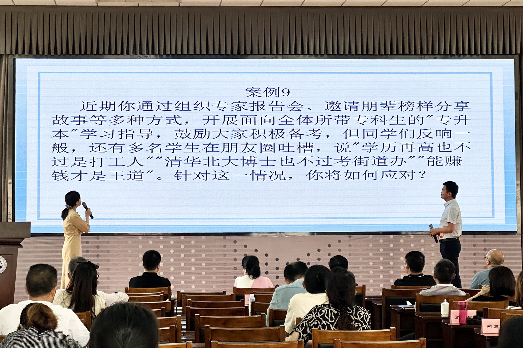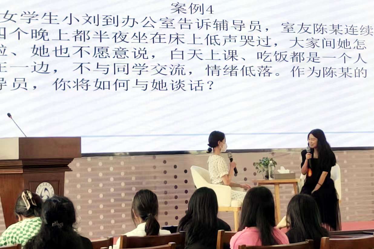 案例分析以一问一答的形式开展,参赛辅导员们围绕具体案例共同辨析原因、研讨对策、总结规律,展现出综合运用理论分析问题、研判问题的能力。选手们从思想剖析和实践行动两个层面入手,从容应答,观众席掌声迭起。谈心谈话以情景再现的方式还原日常师生对话场景,主要考察辅导员对学生特征、学生成长规律的了解和把握程度。谈话结束后,选手需结合谈话情况回答评委提出的问题。该环节聚焦学生思想动态、学业规划、人际交往等实际问题,展现了辅导员解决学生实际困惑和教育引导等能力。