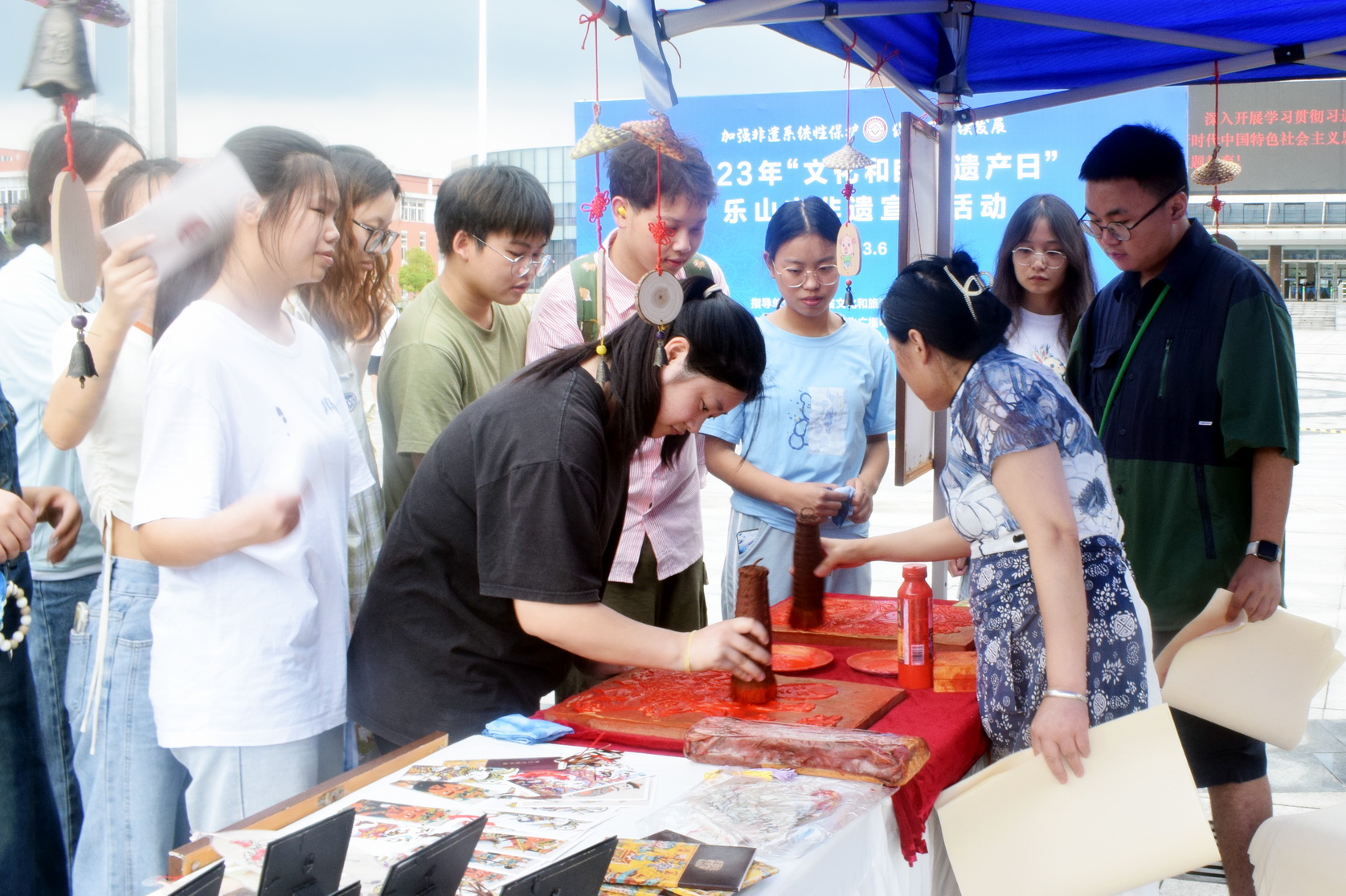 活动还组织了夹江年画、峨眉扎染、闲梁面塑、“伟老汉”小米米花糖、“古真记”钵钵鸡、太平豆腐干6个非遗项目及其传承人,现场开展非遗项目展示及体验活动。师生亲自参与项目体验,近距离感受乐山非遗魅力。