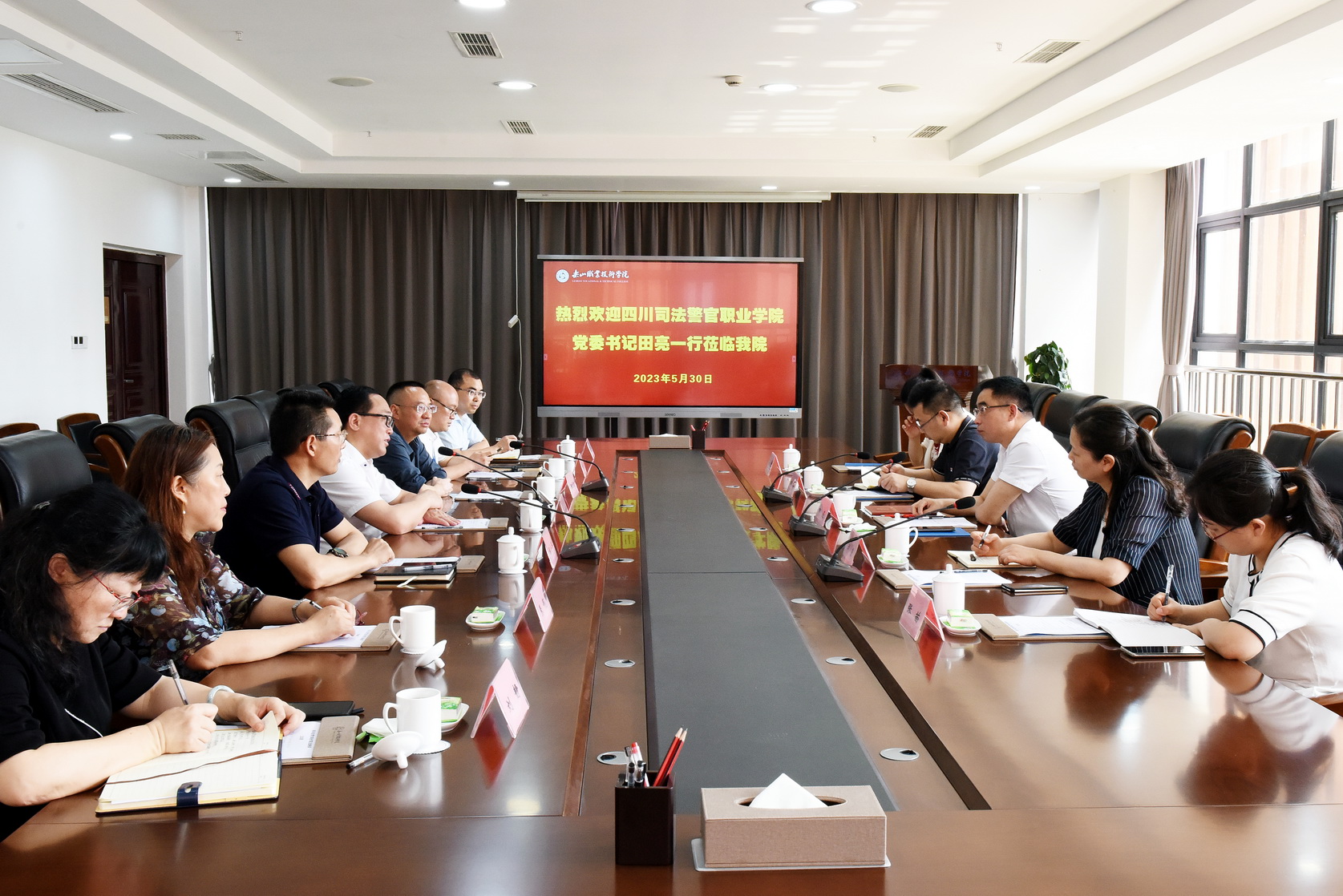 2023年5月30日上午,四川司法警官职业学院党委书记田亮,党委委员、副院长胡蓉及招生就业处相关人员一行5人莅临beat365英国官方网站考察交流。交流座谈会在学术交流中心2001会议室进行,beat365英国官方网站党委书记成定彬,党委委员、副校长陈元进,后勤处、学生工作部相关负责人参加了交流座谈会。