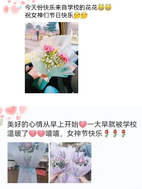 3月8日清晨,女教职工们在进入校园的第一时间,就收到了来自学院的鲜花慰问,开启了“三八”国际妇女节美好的一天。女教职工们在收到鲜花后纷纷在朋友圈晒出自己内心满满的喜悦:“美好的心情从早上开始,一大早就被学校温暖了”,“今日这份快乐来自学校送的花花”,“学院和系部送的鲜花,让这个节日充满了仪式感”。