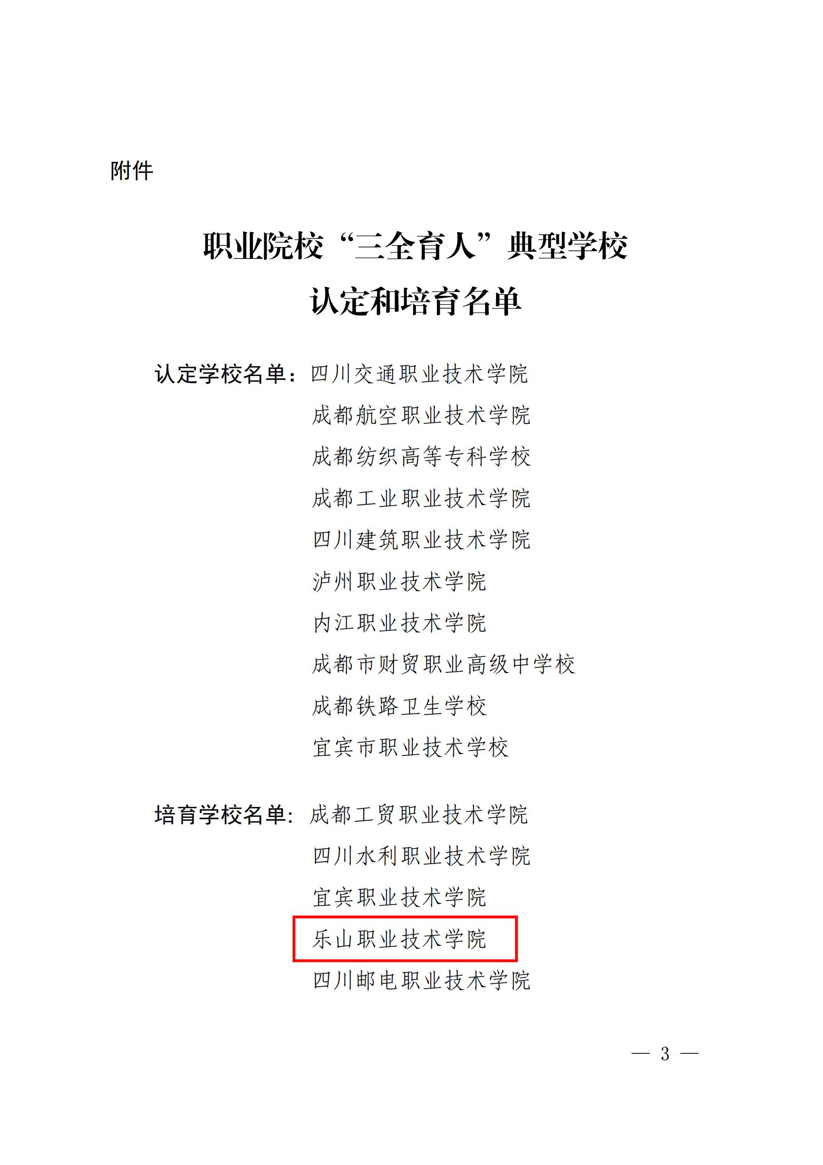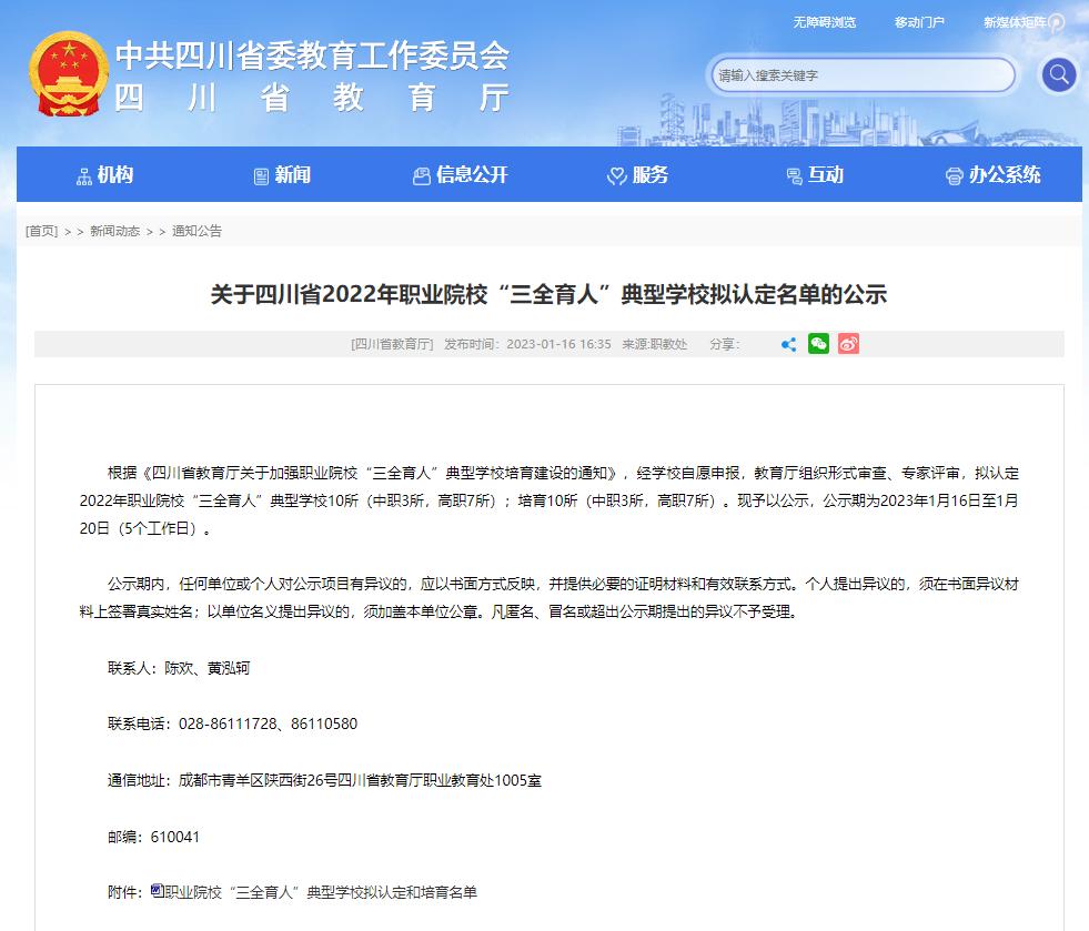 根据四川省教育厅文件通知,我院被认定为四川省2022年职业院校“三全育人”典型学校培育学校 。